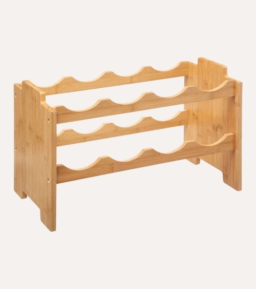El diseño minimalista del soporte permite un acceso fácil a tus botellas, mientras que sus tres estantes horizontales curvados crean un patrón ondulado que añade interés visual. La estructura compacta se adapta perfectamente a encimeras o estanterías, sin ocupar demasiado espacio. Con un acabado natural, el bambú presenta variaciones sutiles en color y textura, lo que lo convierte en una pieza única.