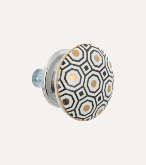 - Diseño Geométrico: Con un patrón hexagonal en negro sobre un fondo blanco, cada knob presenta sutiles acentos dorados que añaden un toque de sofisticación.
