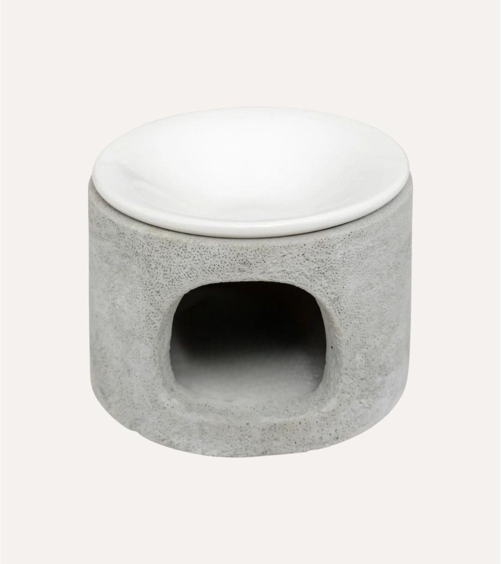 Su base está elaborada en cemento, lo que le confiere una textura natural y un acabado ligeramente poroso que aporta carácter y robustez. La parte superior cuenta con un plato circular de dolomita blanca, brillante y resistente, ideal para contener aceites esenciales o cera aromática mientras se calientan suavemente. Este contraste entre la base gris del cemento y el blanco luminoso del plato crea un equilibrio visual atractivo que realza cualquier ambiente.