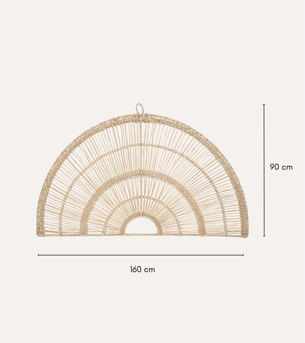 Descubre el Cabecero Padma de Caña, una pieza decorativa que aporta elegancia y funcionalidad a tu hogar. Ideal para quienes buscan un toque bohemio y natural, está fabricado con materiales orgánicos como la caña y la fibra vegetal, lo que lo hace ligero y resistente. Su diseño distintivo en forma de semicírculo con un patrón de arcos concéntricos irradia desde un punto central. Su color beige claro y textura tejida aportan calidez y resaltan la artesanía. Se adapta a estilos decorativos variados, desde rústico hasta moderno. Dimensiones: 160 x 0.6 x 90 cm. Material: Acero y fibra vegetal. Estilo: Bohemio y minimalista. Peso ligero: Fácil de colgar y mover. Incluye un lazo para colgarlo fácilmente en la pared.