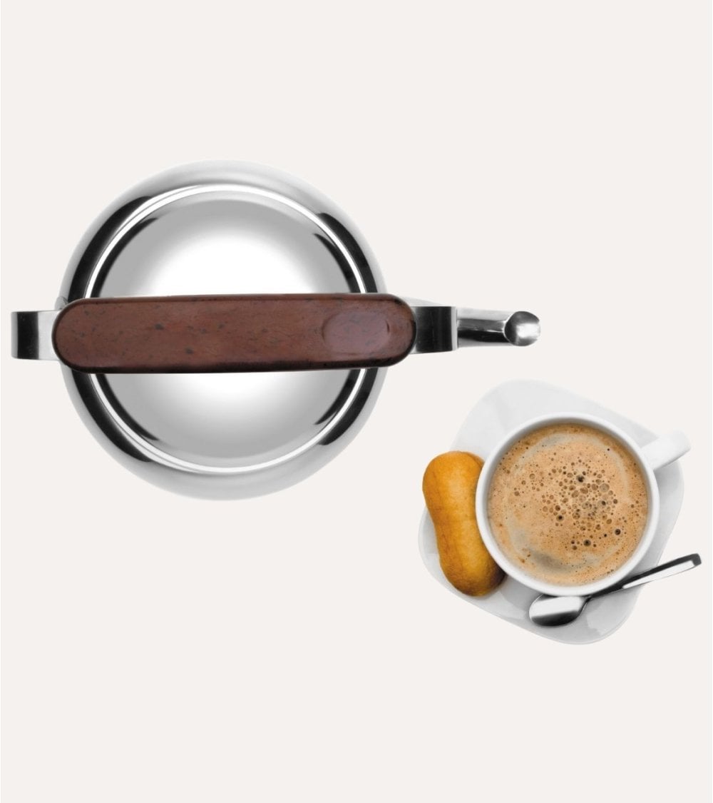 - Mango ergonómico: Madera oscura que ofrece comodidad y seguridad al manipular la tetera caliente.