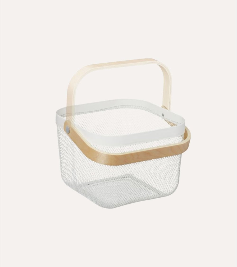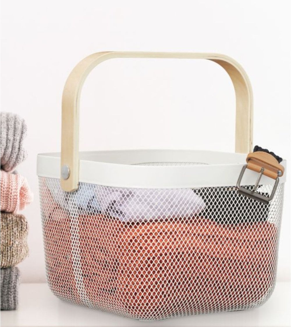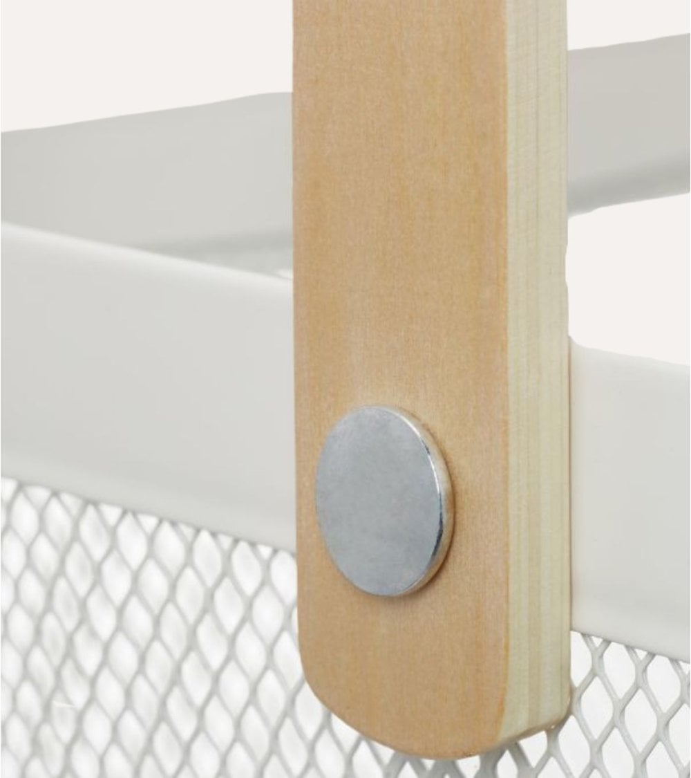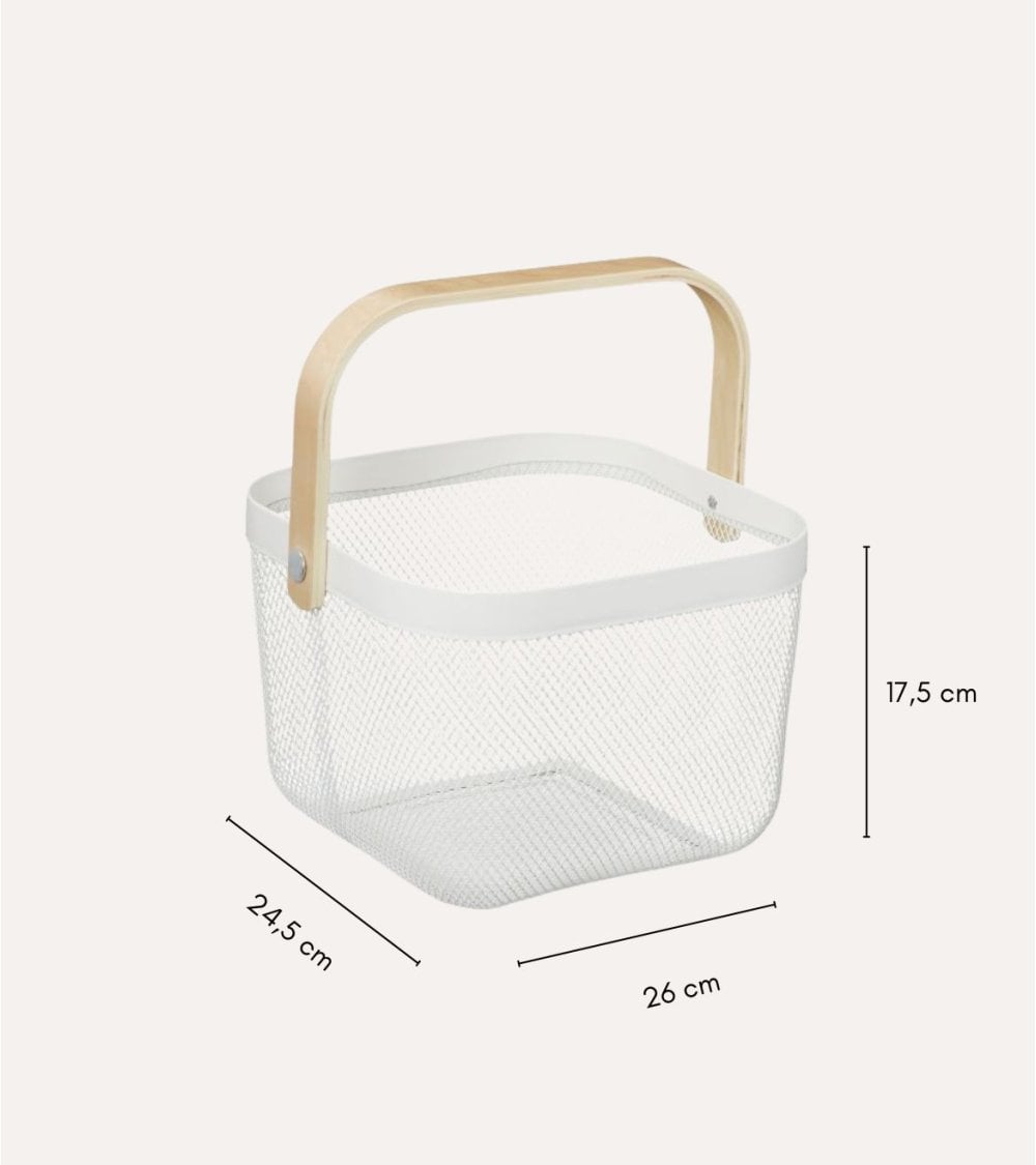 La combinación del marco blanco con el mango natural crea una paleta de colores atractiva que complementa cualquier decoración moderna. La textura rígida del material metálico se equilibra perfectamente con la suavidad del mango, ofreciendo tanto durabilidad como comodidad al usarla. Además, su diseño abierto permite acceder fácilmente a los objetos almacenados, lo que la convierte en una opción práctica para mantener todo organizado y a la vista.