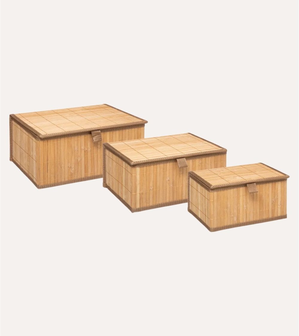 Estas cajas son ideales para organizar desde materiales de oficina, juguetes hasta accesorios decorativos o manualidades. Su acabado natural en tonos claros del bambú aporta calidez y armonía visual en cualquier habitación, complementando estilos decorativos eco-friendly o rústicos.