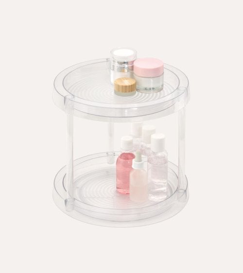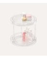 Su diseño circular con dos niveles permite aprovechar el espacio vertical, ideal para almacenar desde productos de belleza hasta utensilios de cocina o material de oficina. Gracias a su base giratoria, acceder a cada artículo es sencillo y rápido, sin necesidad de mover toda la bandeja.