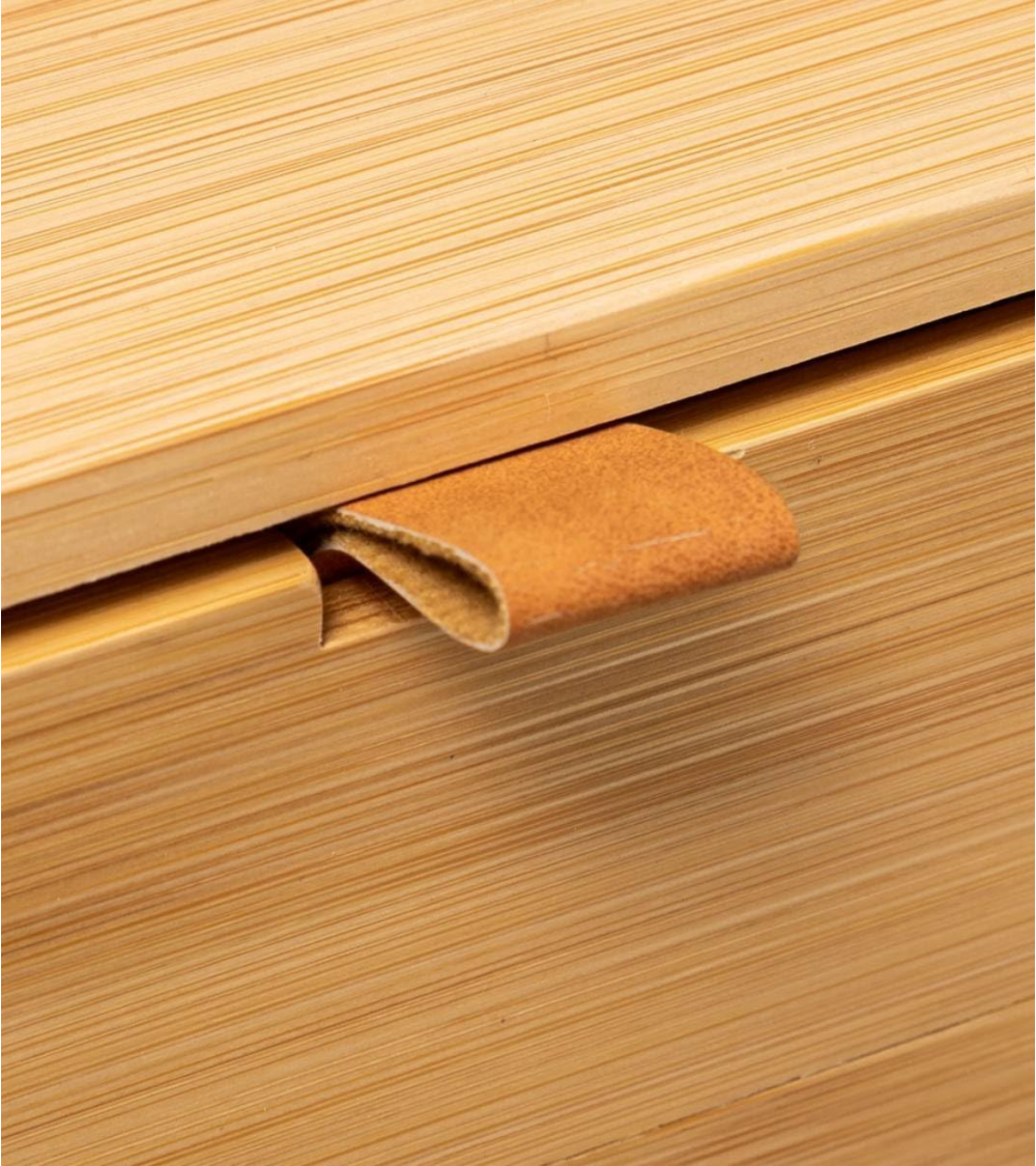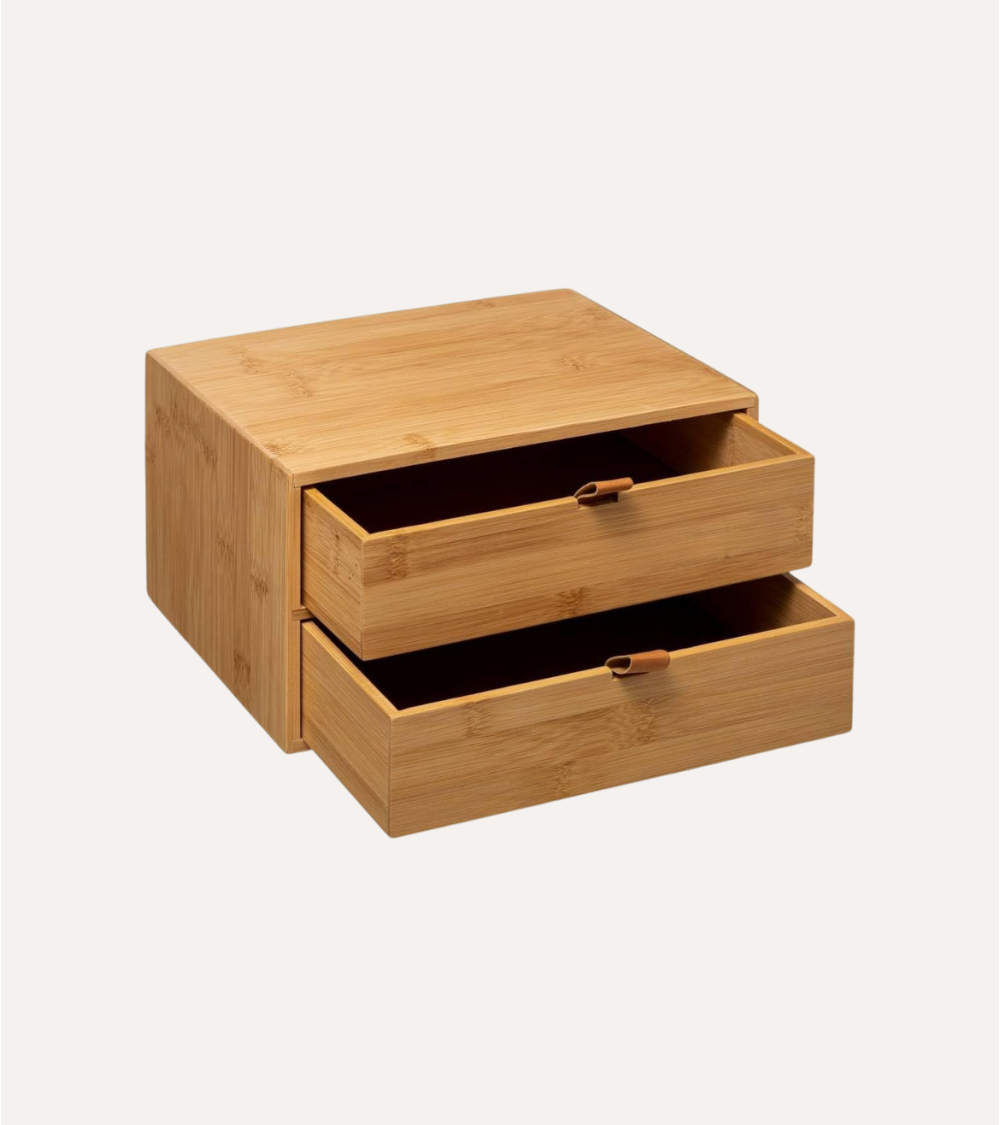El diseño minimalista de la Caja de Almacenamiento 2 Cajones de Bambú enfatiza la funcionalidad sin sacrificar el estilo. La superficie plana superior puede ser utilizada tanto para almacenamiento adicional como para exhibir decoraciones personales, convirtiéndola en un elemento versátil dentro del hogar.