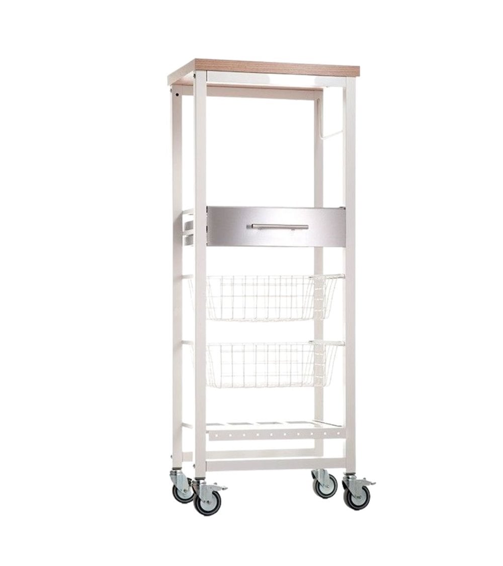 Este modelo de carro se caracteriza por contar con dos cestas de rejilla, un cajón con estante intermedio y un botellero donde podrás organizar tus alimentos de una manera más sencilla. Disponible en color blanco para que puedas combinarlo a la perfección con la decoración de tu estancia.