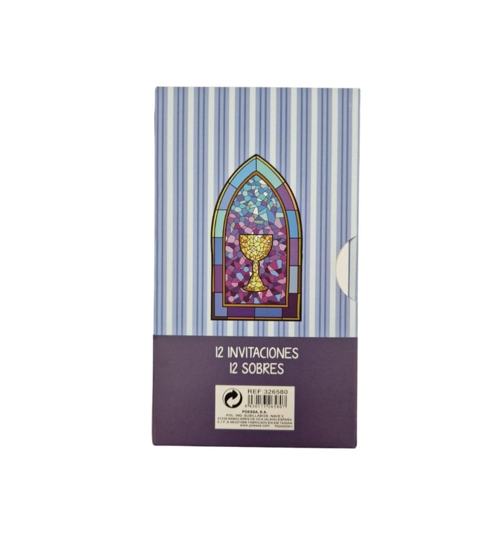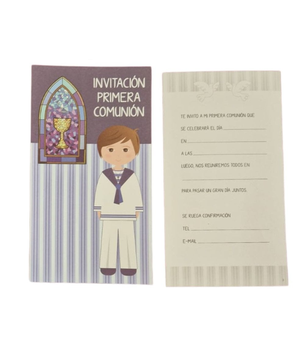 Este set de 12 invitaciones de Mi Primera Comunión con sobre es perfecto para celebrar este evento tan especial. Las invitaciones son elegantes y de alta calidad, ideales para invitar a familiares y amigos a compartir este momento único. Cada set incluye sobres a juego, facilitando el envío de las invitaciones.