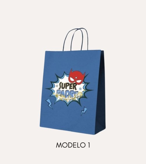 - Tema Divertido: La bolsa derecha destaca con el texto "SUPER PADRE" en una fuente juguetona, rodeada por un estallido al estilo cómic y una máscara roja de superhéroe, perfecta para los papás aventureros.
