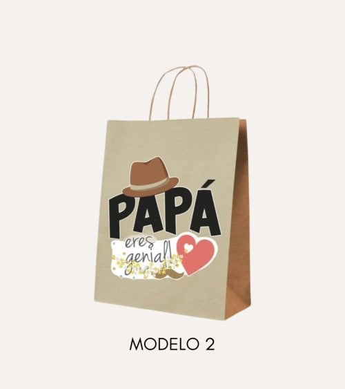 - Bolsas Atractivas: La bolsa izquierda presenta un fondo marrón kraft con la palabra "PAPÁ" en letras grandes y negritas, complementada por la frase "eres genial". Un sombrero marrón y un corazón añaden un toque personal.