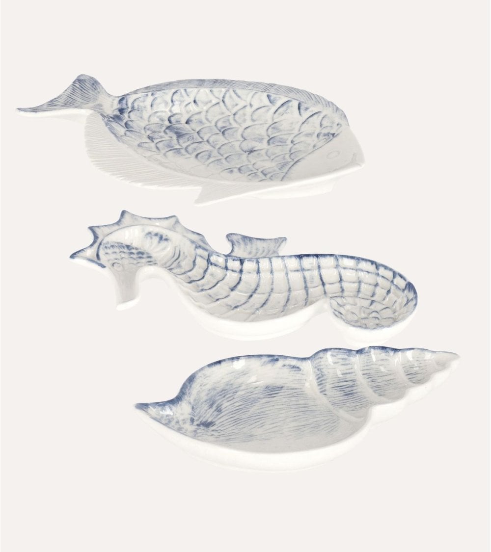 Esta bandeja está diseñada en forma de pez, evocando la frescura del mar y aportando un estilo náutico que se adapta perfectamente a ambientes modernos o clásicos. Su acabado en porcelana blanca con detalles en azul realza cada curva y textura, haciendo que cada pieza sea un verdadero centro de atención en tu mesa o centro de sala.