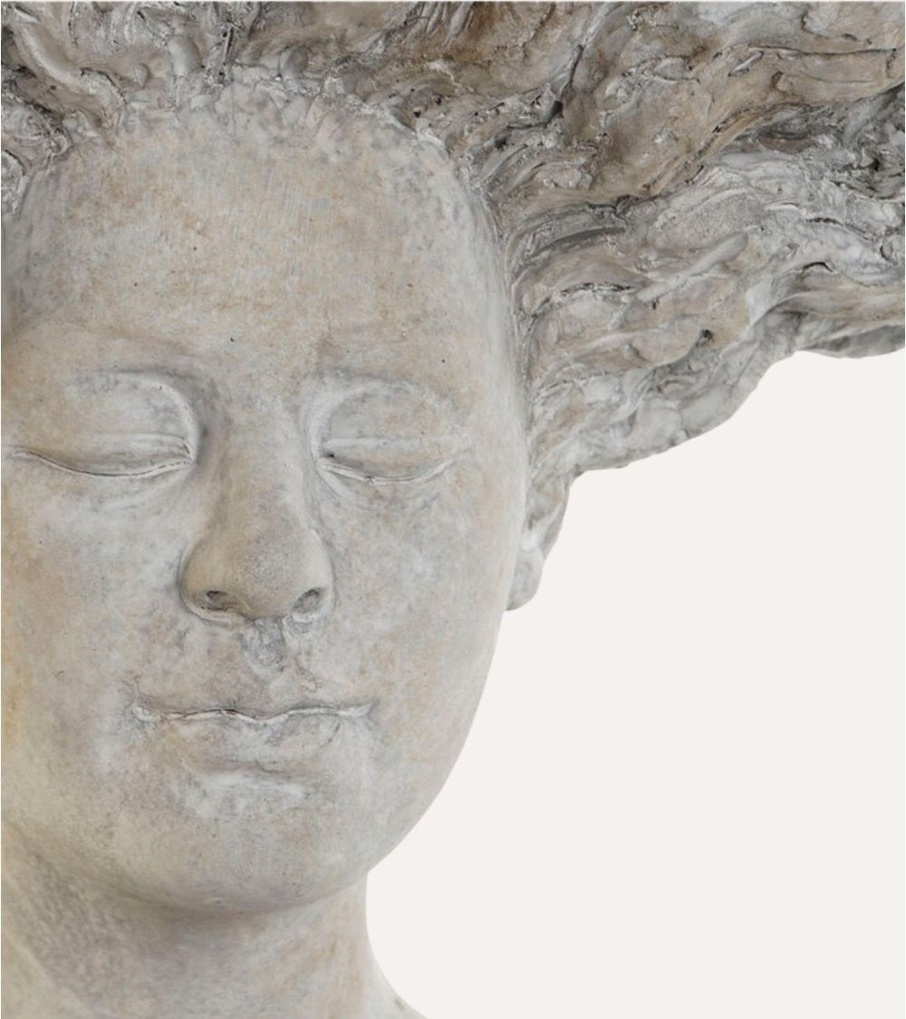 La figura femenina esculpida muestra una expresión tranquila, con los ojos cerrados en una pose reflexiva. La transición del cuello hacia la base es sutil pero firme, proporcionando estabilidad a esta obra maestra decorativa. Sin embargo, lo más llamativo es su cabello: un diseño fluido y exagerado que evoca olas o nubes, creando una silueta dramática y dinámica.