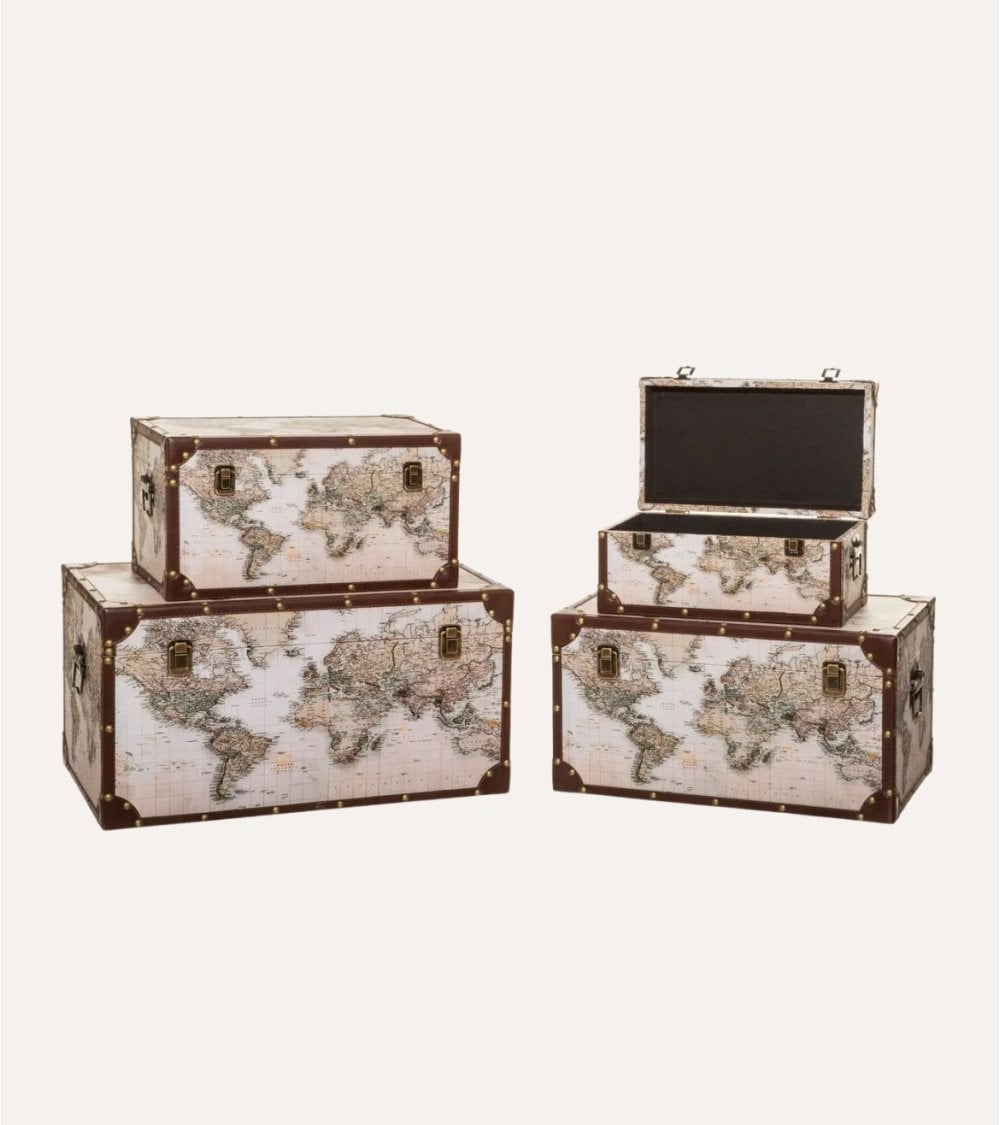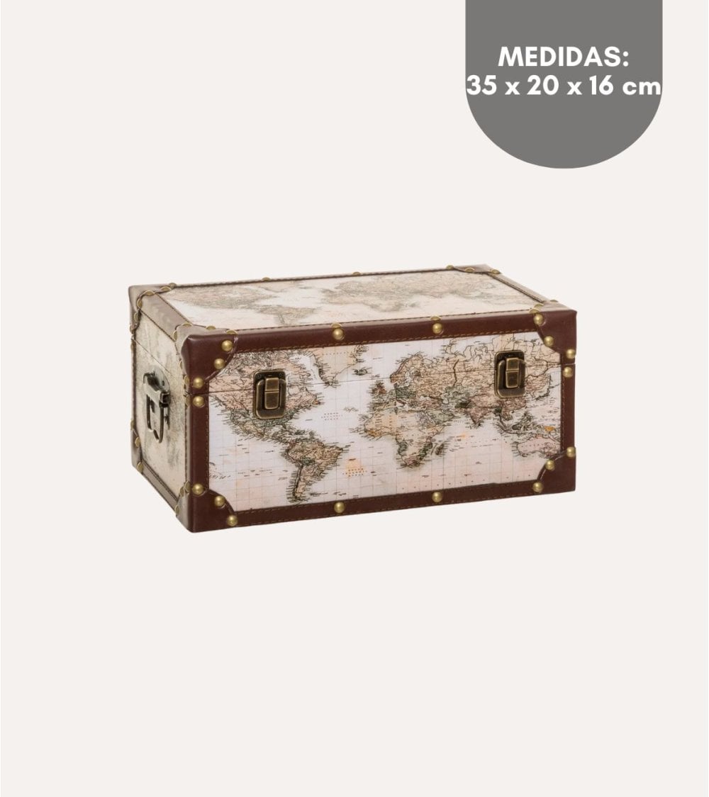 Este baúl no solo es funcional sino también un elemento decorativo perfecto para salas, dormitorios u oficinas. Su estética rústica y temática viajera invita a soñar con destinos lejanos mientras mantiene el orden en tu hogar.