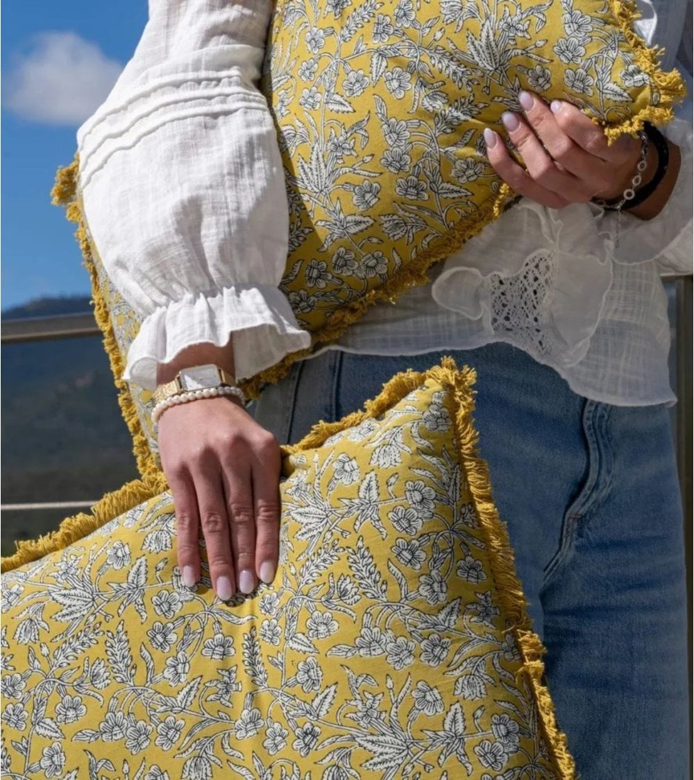 El diseño del cojín está adornado con patrones florales y botánicos intrincados en tonos contrastantes suaves, como blanco o gris claro, que realzan la elegancia sin perder la frescura. Además, sus bordes cuentan con un detalle de flecos ligeramente despeinados que aportan textura y un aire artesanal muy actual.