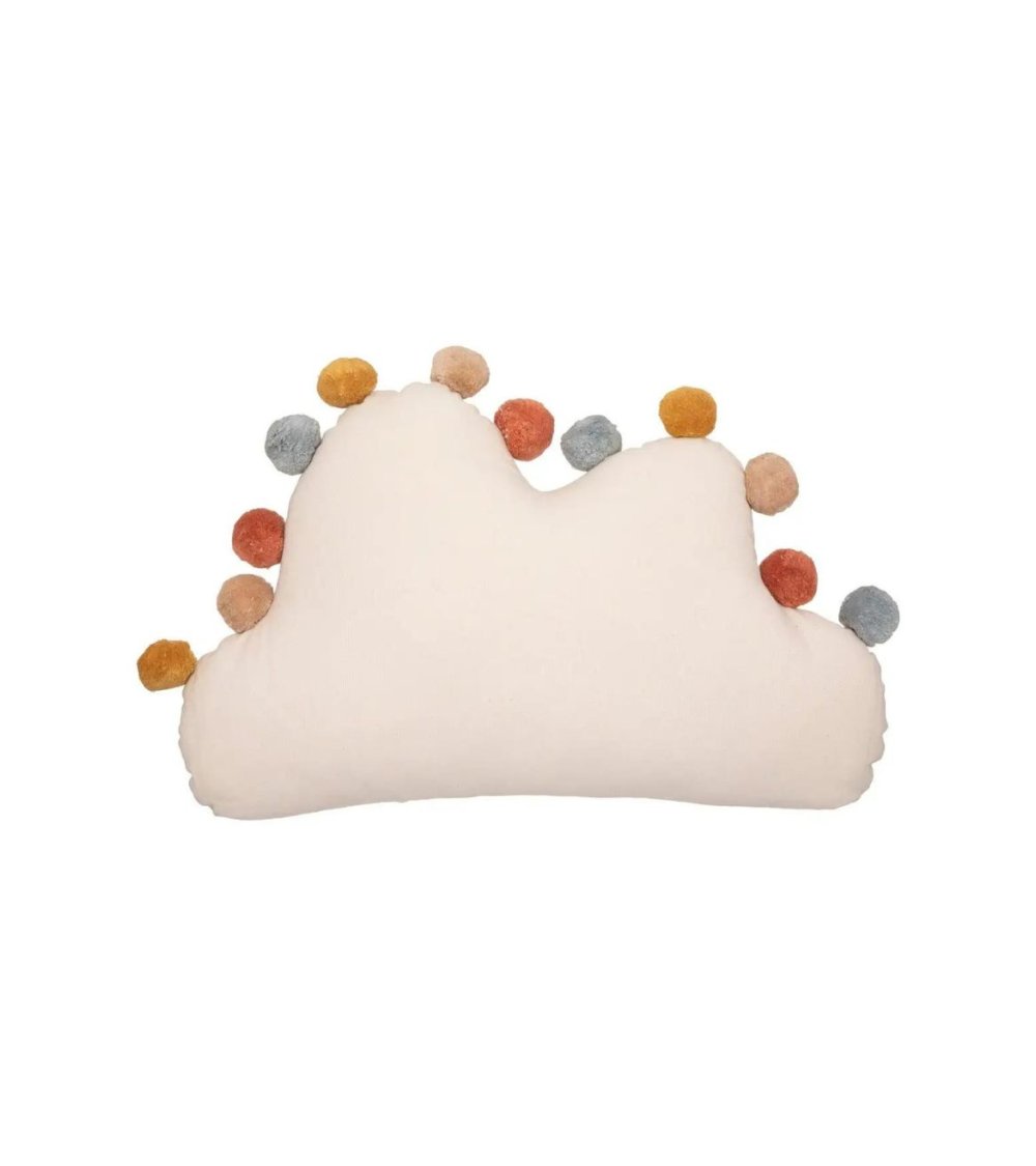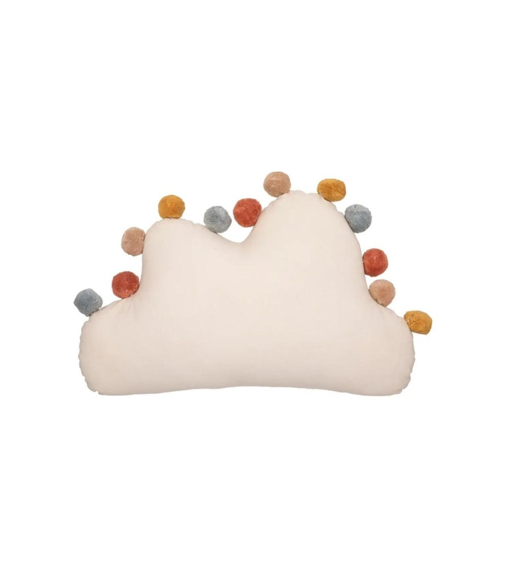 Cojín elaborado en algodón y poliéster de color blanco con forma de nube y pompones de colores a lo largo de toda la parte superior.