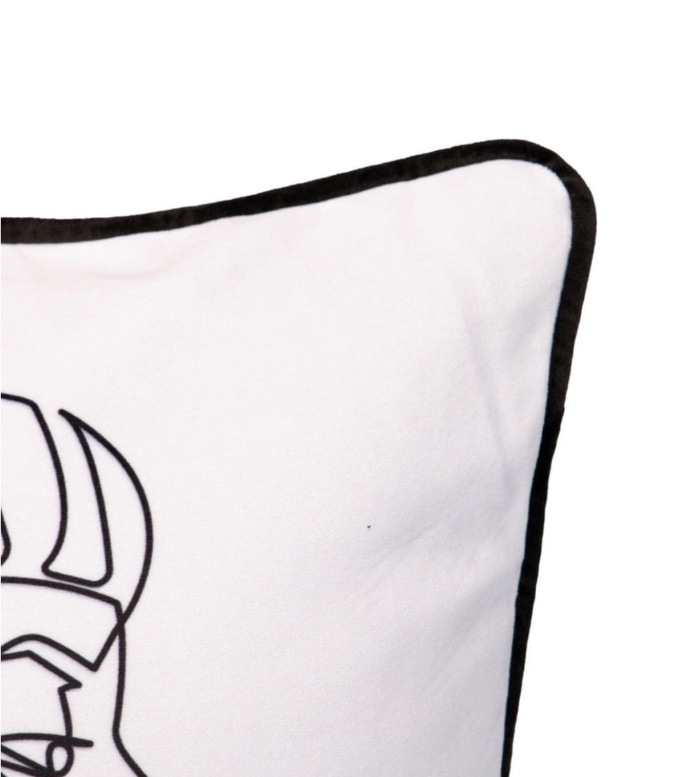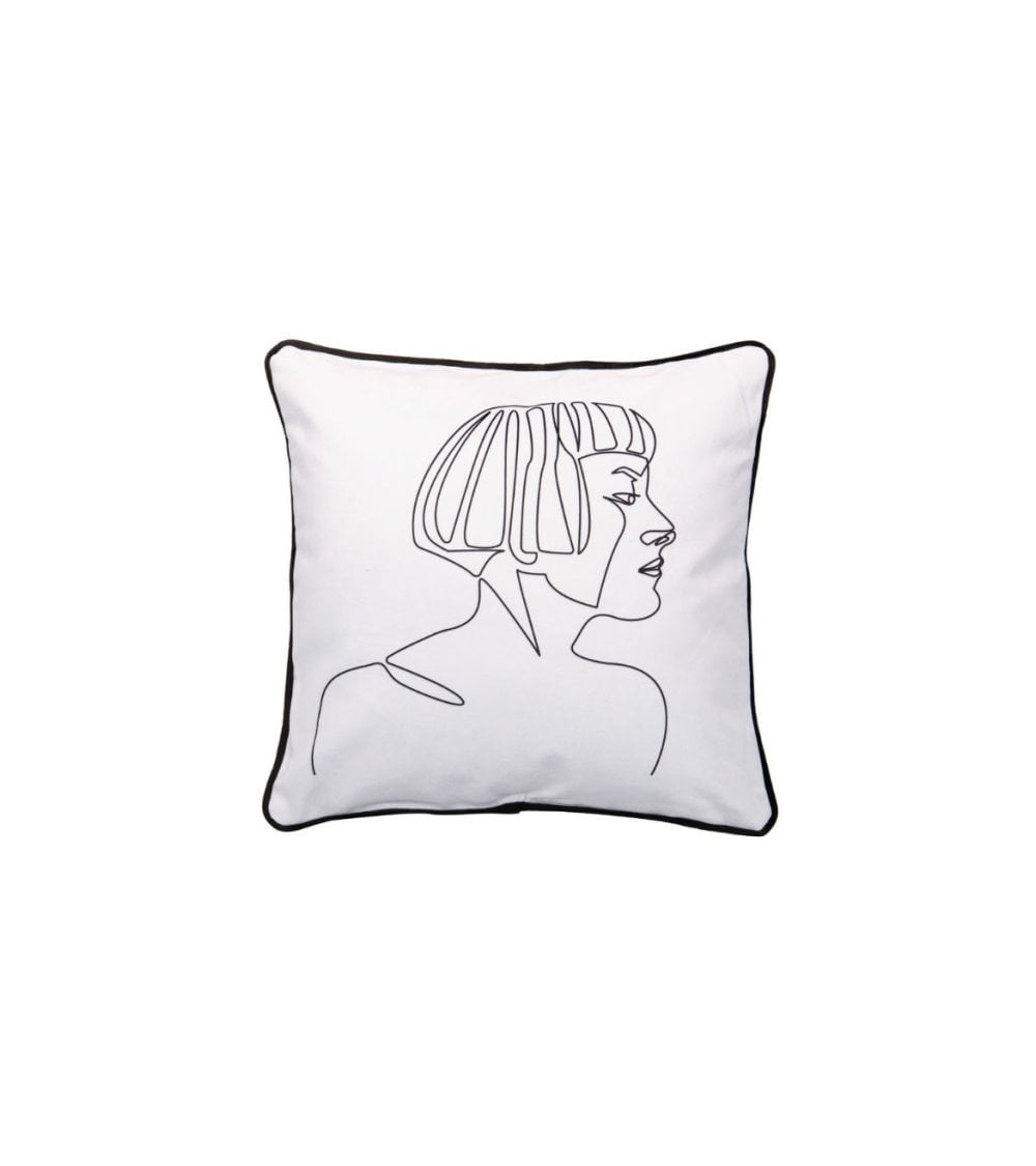 Este cojín está confeccionado en terciopelo suave de alta calidad con un diseño estampado de figuras geométricas en la parte trasera y una silueta de la cara de una mujer en la parte delantera. Ambos estampados en color negro sobre fondo blanco.