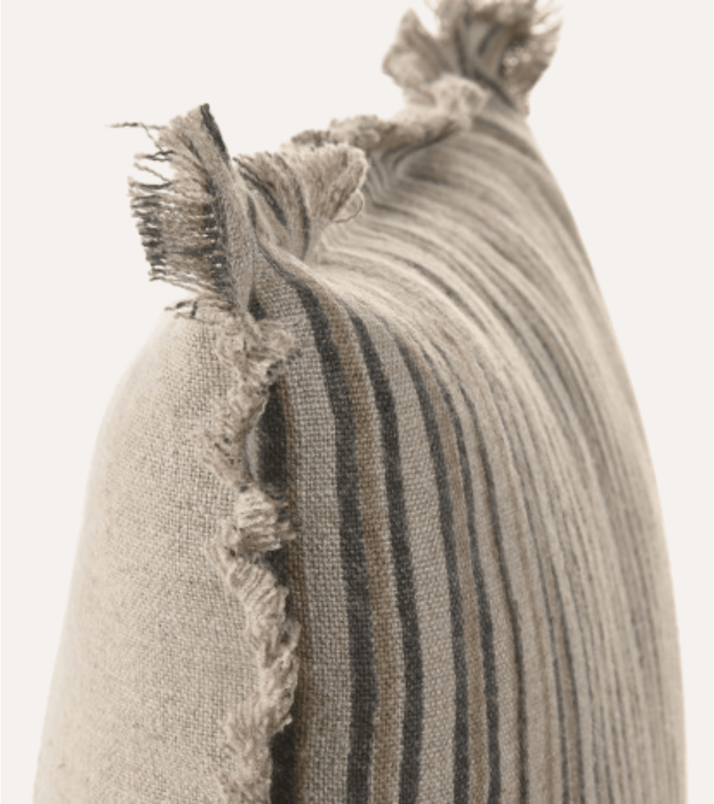 El cojín Terra a rayas destaca por su patrón de finas rayas verticales en tonos neutros como beige y taupe, complementadas con líneas más oscuras que aportan profundidad y elegancia. Su textura tejida en lino ofrece una sensación suave pero resistente, perfecta para uso diario tanto en sofás como en camas o sillones.