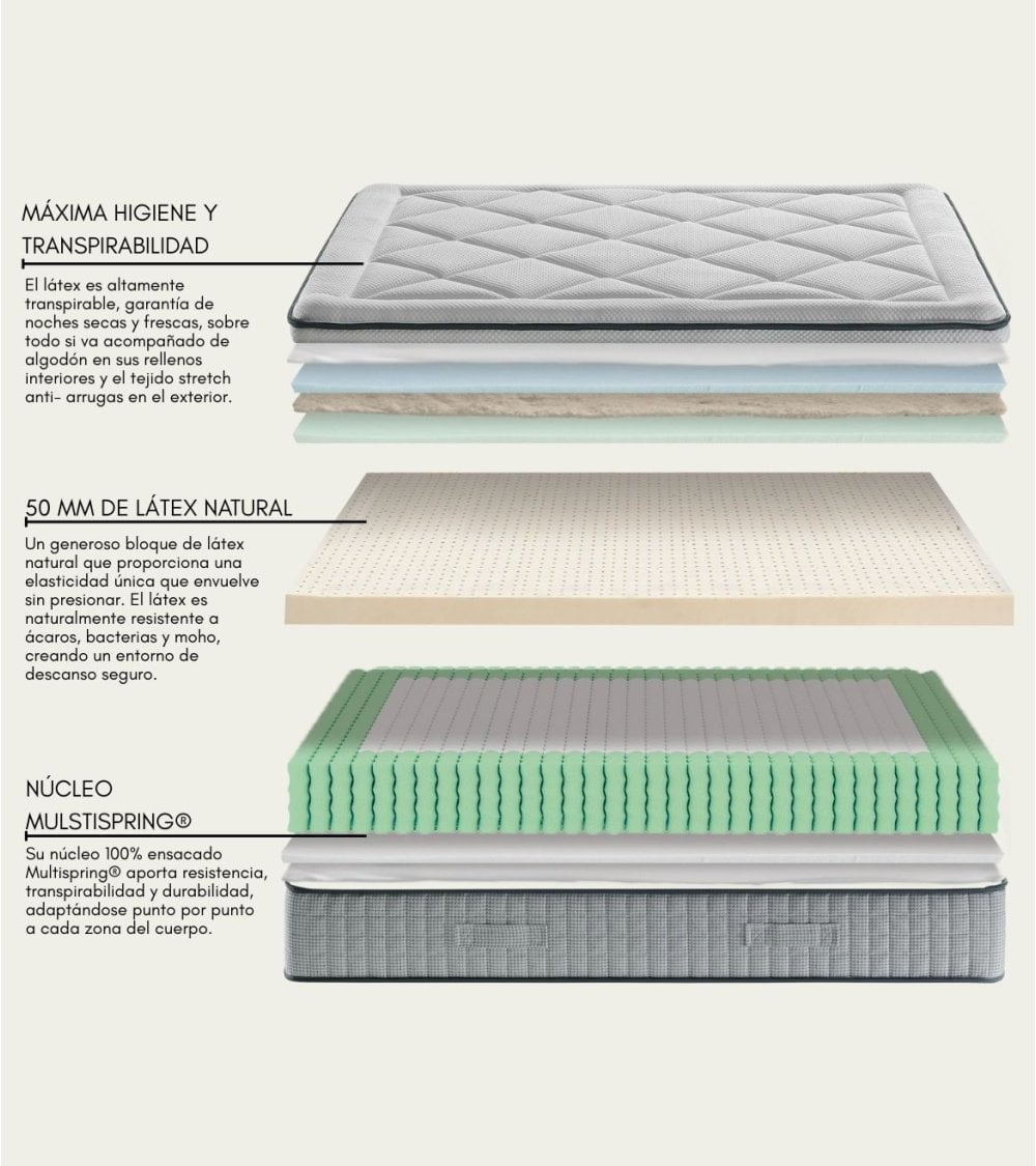 - NÚCLEO: núcleo 100% ensacado Multispring® aporta resistencia, transpirabilidad y durabilidad, adaptándose punto por punto a cada zona del cuerpo.