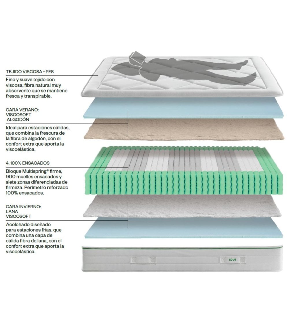 Descubre el confort a otro nivel con el Colchón DUBLIN SEASONS Enrollado de ECUS, diseñado meticulosamente para ofrecerte el mejor descanso en cualquier estación del año. Este colchón no solo se adapta a tus necesidades térmicas, sino que también brinda un apoyo inigualable gracias a su innovador sistema de muelles ensacados.