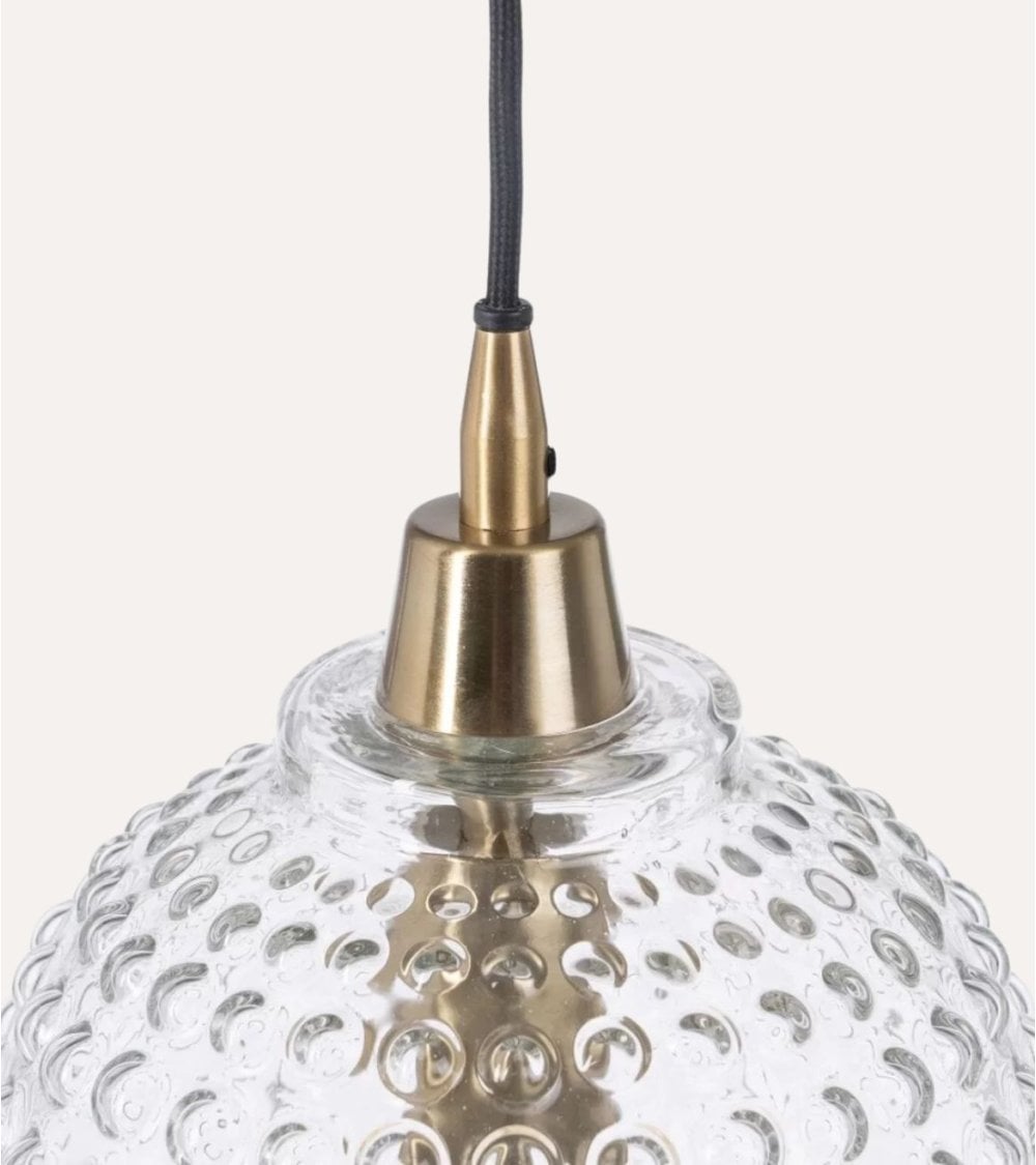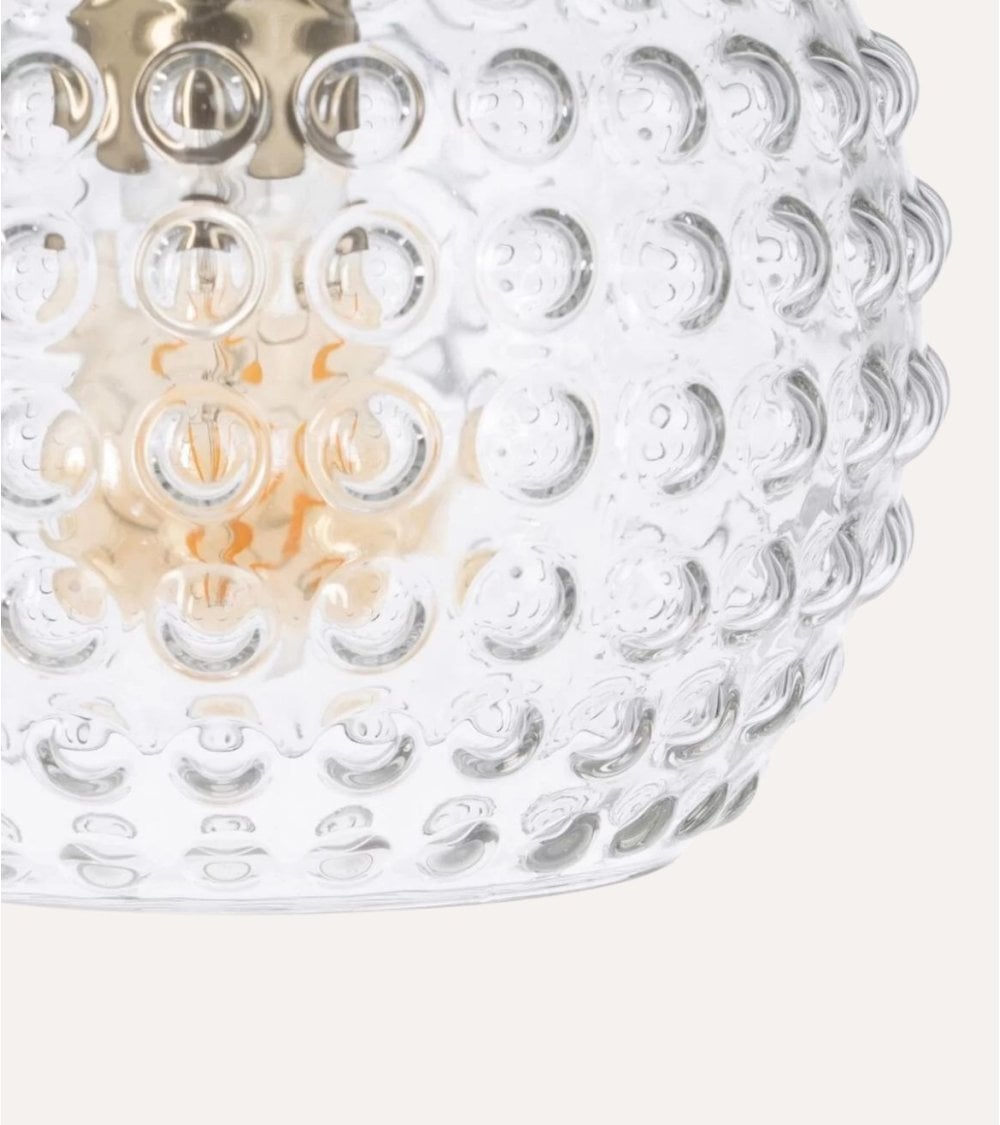 Su diseño redondo y esférico aporta una estética suave y acogedora, perfecta para iluminar áreas como comedores, cocinas o salones. La pantalla está elaborada en cristal transparente con un acabado texturizado que presenta patrones circulares elevados, lo que no solo añade un detalle visual atractivo sino que también mejora la difusión de la luz, creando ambientes cálidos y envolventes.