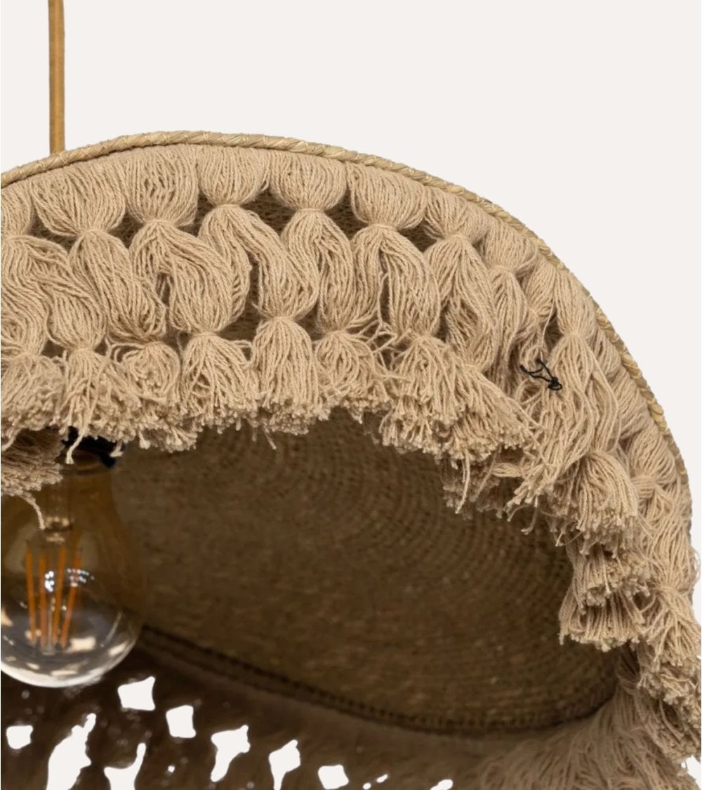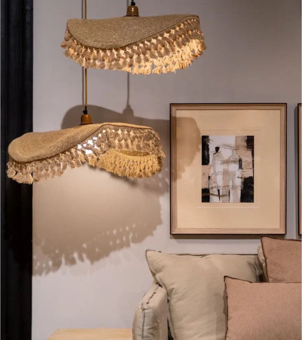Su estructura está elaborada con fibra vegetal natural, lo que le confiere una textura tejida y un acabado cálido en tonos beige o arena. La forma asimétrica con silueta ondulada aporta dinamismo visual, mientras que el detalle de flecos con pequeños tassels en el borde inferior añade un carácter relajado y distintivo. Esta combinación hace que la lámpara sea perfecta para ambientes residenciales como comedores, cocinas o salas de estar, así como para espacios comerciales como cafeterías o boutiques con enfoque en decoración natural.