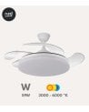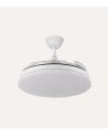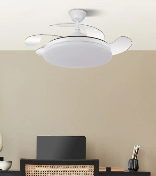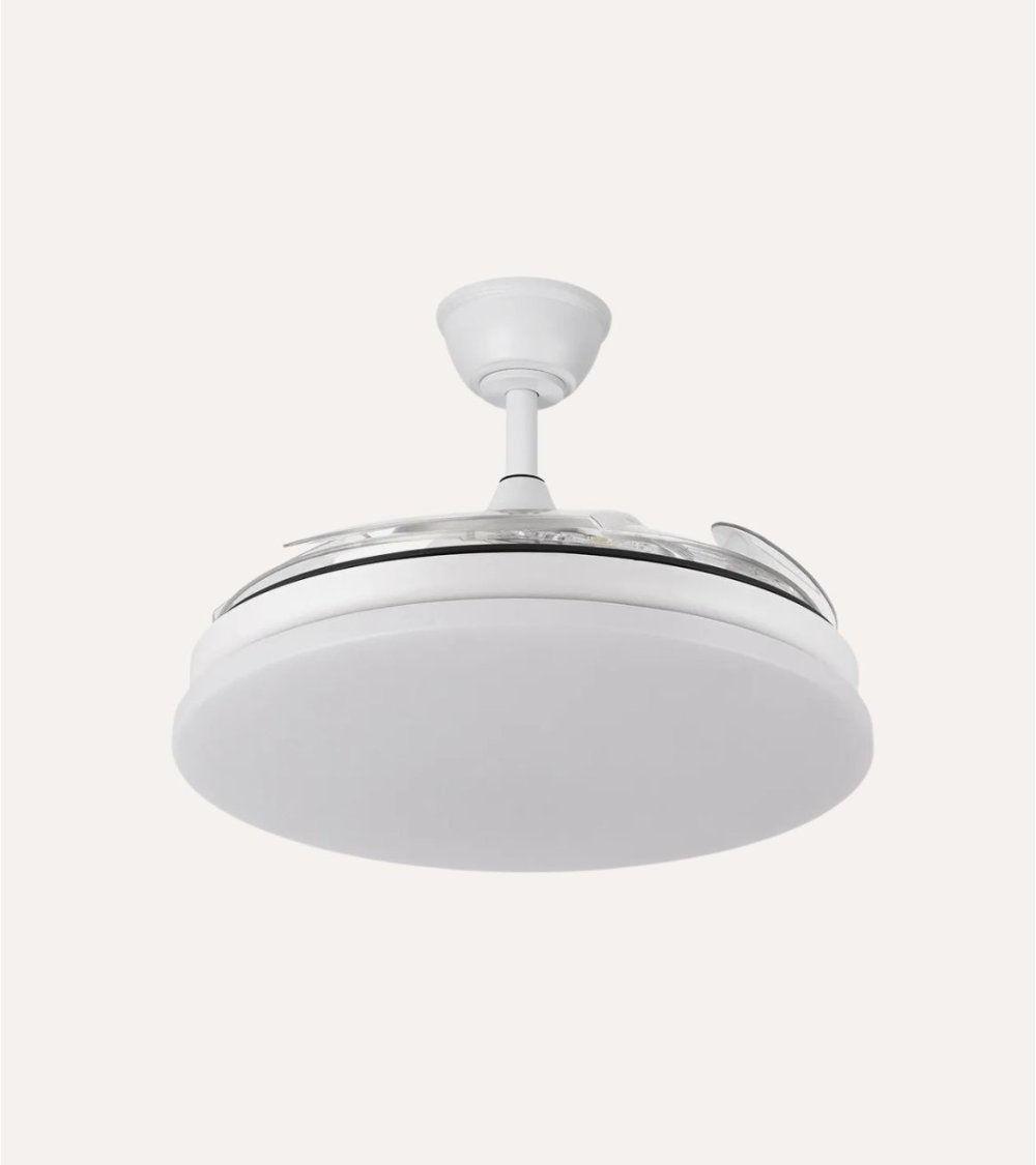 Este ventilador cuenta con aspas retráctiles que se despliegan cuando está en funcionamiento, ofreciendo un flujo de aire óptimo, y se ocultan cuando está apagado, manteniendo una apariencia elegante y minimalista. Su lámpara LED integrada proporciona una iluminación clara y agradable, perfecta para crear ambientes acogedores en salas, dormitorios o comedores.