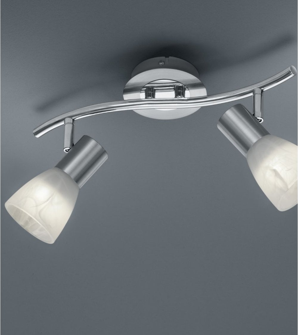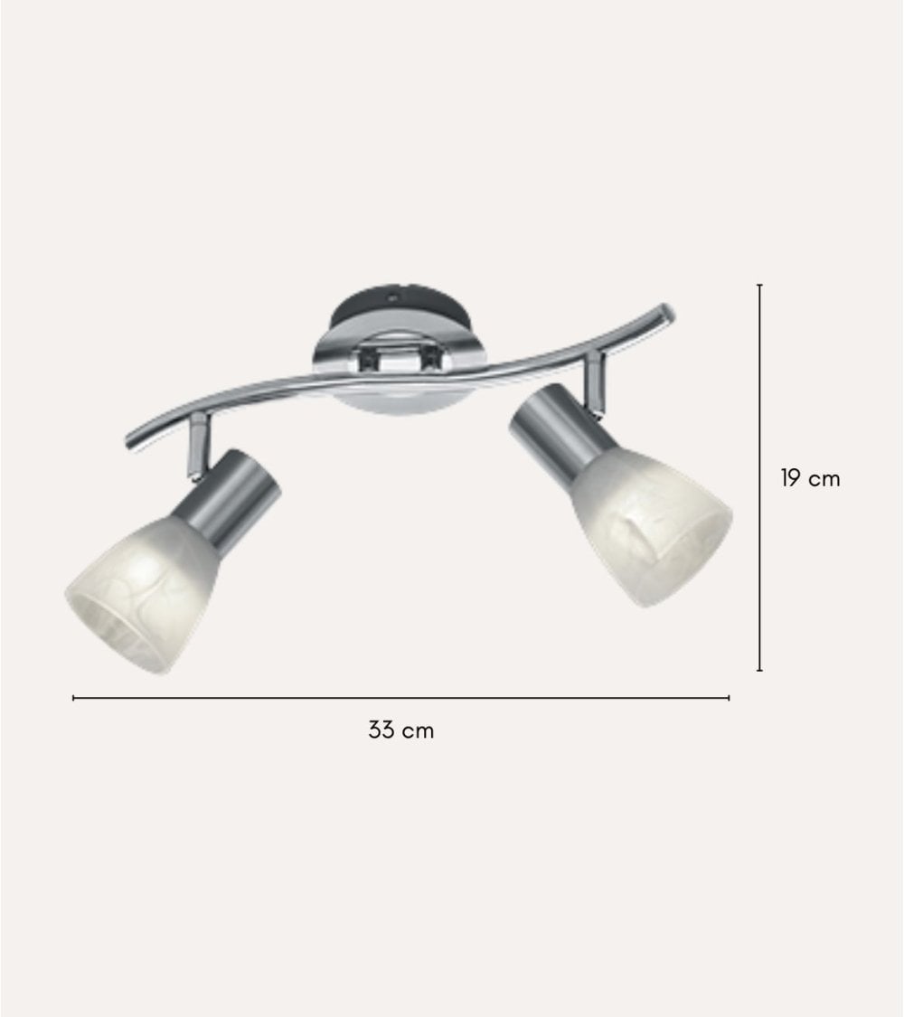 Su estructura está elaborada en metal resistente con acabado cromado, lo que garantiza durabilidad y un toque sofisticado. La lámpara cuenta con dos focos que se encuentran protegidos por pantallas de vidrio semitransparente con acabado ligeramente esmerilado, permitiendo una iluminación suave y agradable que crea ambientes cálidos y acogedores.