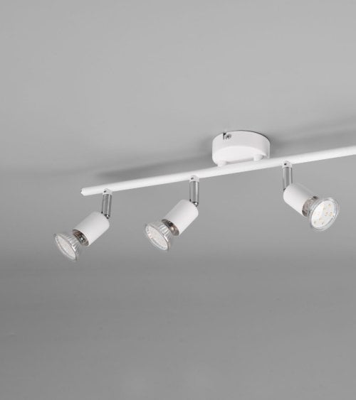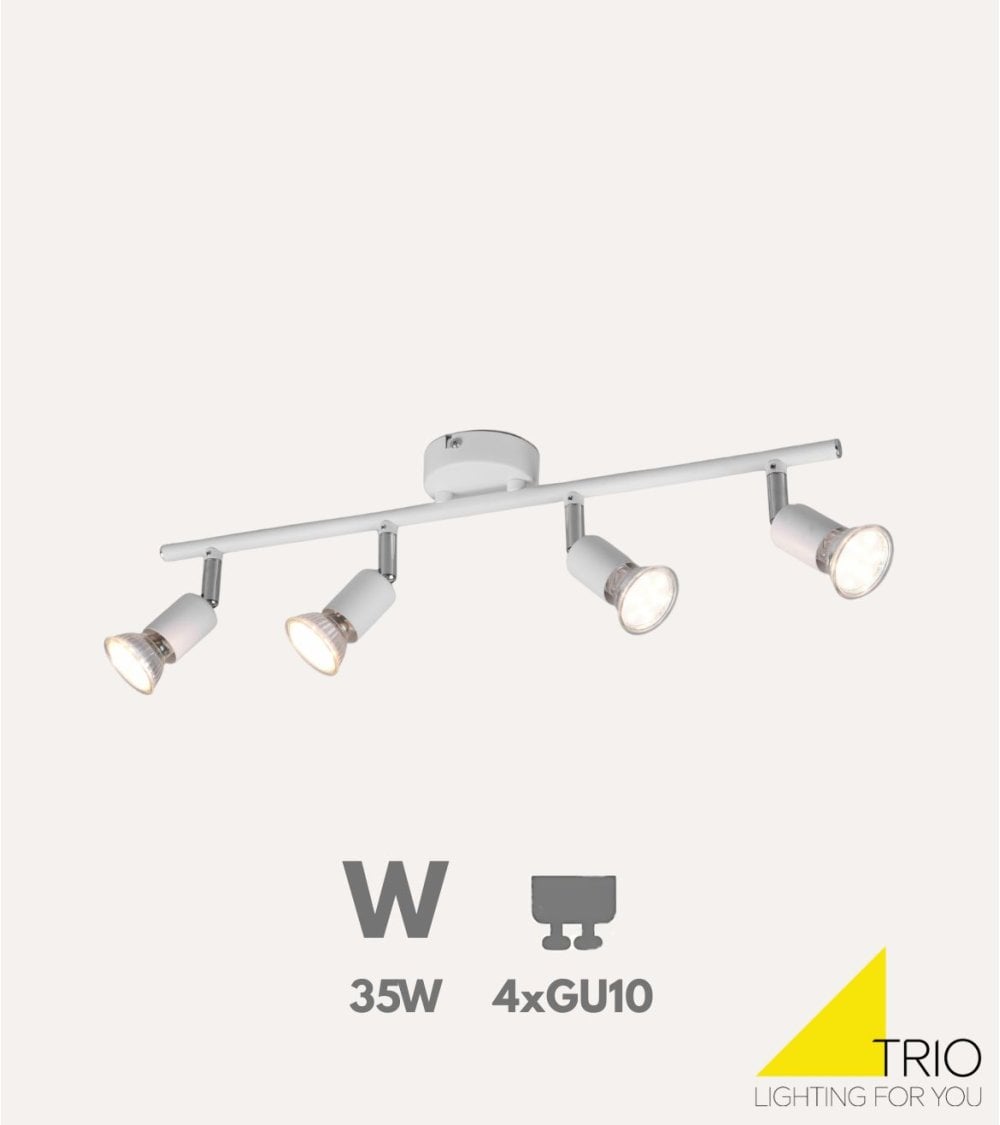 Esta lámpara está diseñada con un cuerpo principal de metal resistente, acabado en blanco puro que aporta luminosidad y frescura a tus ambientes. Su estructura permite la instalación en techo, ofreciendo una presencia elegante sin ocupar espacio visual innecesario. Los detalles cromados en las cabezas de luz añaden un toque sofisticado que complementa cualquier decoración moderna.