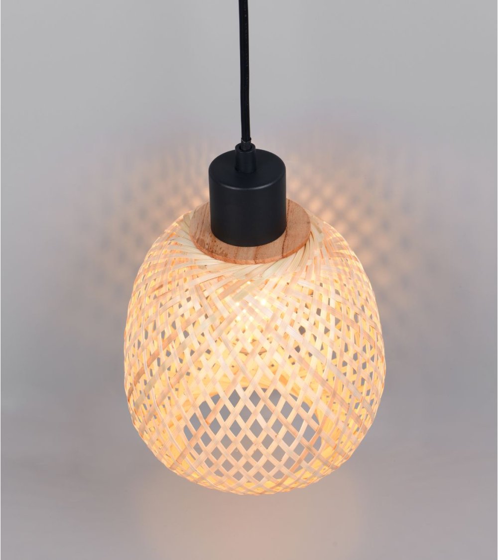 La lámpara presenta una estructura elaborada en bambú, que ofrece una textura natural y un acabado artesanal que se integra perfectamente en ambientes contemporáneos, rústicos o bohemios. Su diseño orgánico con forma redondeada y ligeramente cónica permite que la luz se filtre suavemente a través del tejido, creando una atmósfera íntima y relajante.