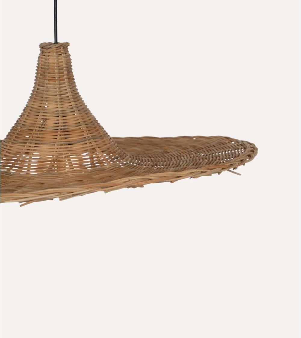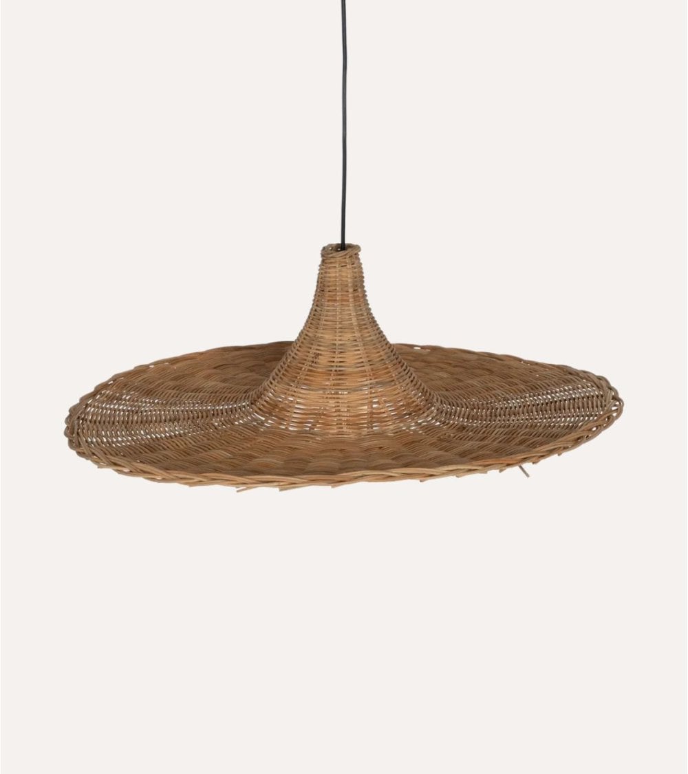 Su diseño se inspira en formas naturales, con una pantalla amplia y ligeramente ondulada que recuerda a un sombrero de ala ancha, confeccionada con fibras trenzadas que permiten una difusión suave y agradable de la luz. Esta característica crea ambientes relajantes ideales para salones, comedores o recibidores.