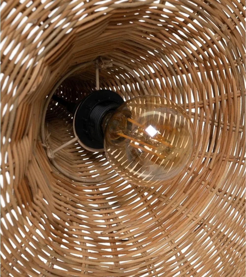 - Diseño: Forma cónica superior con pantalla circular amplia y textura tejida artesanalmente.