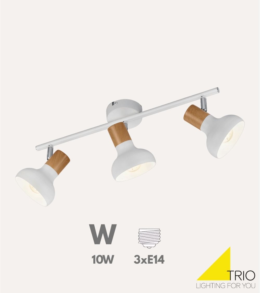 Su estructura está compuesta principalmente de metal resistente, garantizando durabilidad y un acabado sofisticado. La lámpara presenta un diseño minimalista con una barra horizontal que sostiene tres focos, cada uno equipado con portalámparas E14, compatibles con bombillas LED o incandescentes, lo que permite personalizar la intensidad y el ambiente lumínico según tus necesidades.