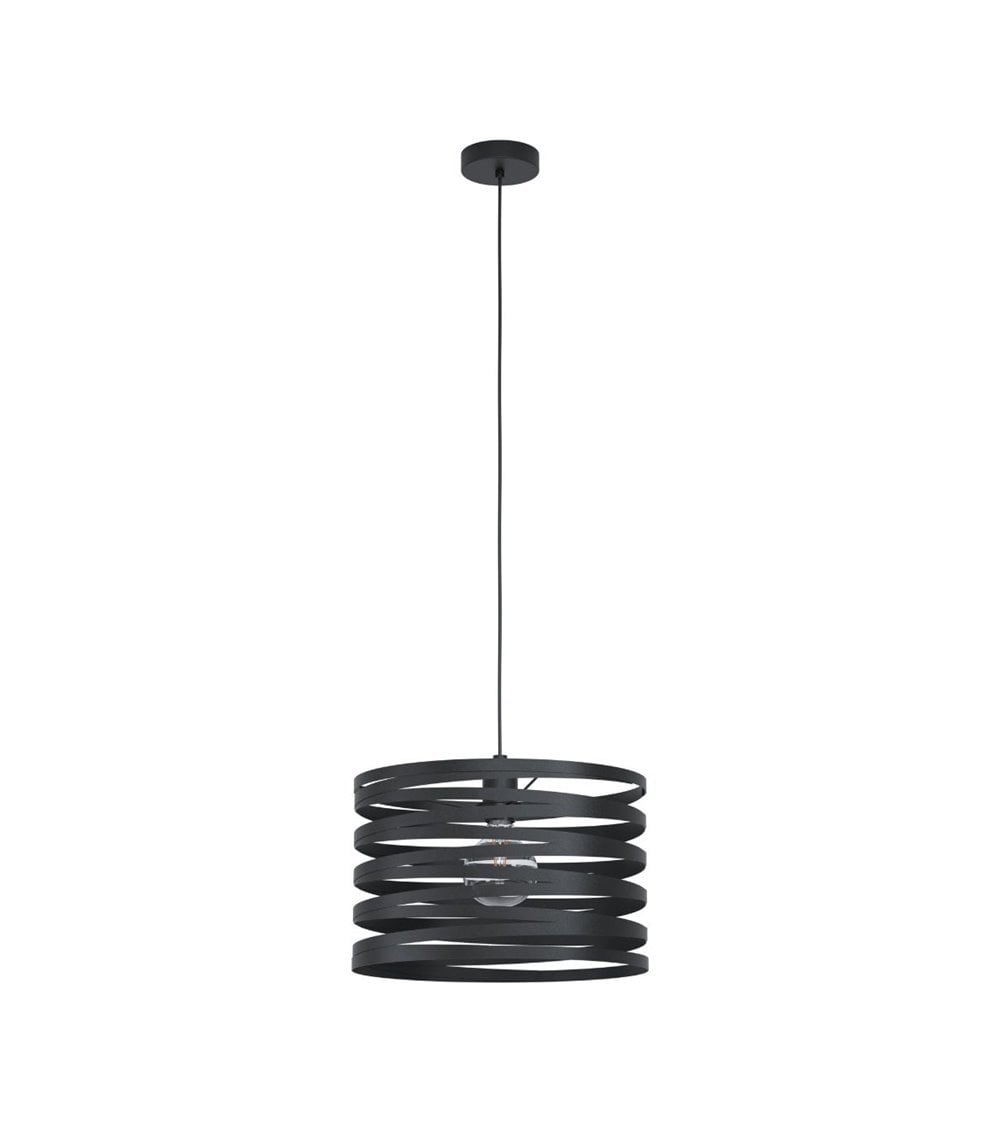 Se trata de una pieza con una pantalla fabricada en metal, con bandas en forma de espiral, suspendida de un dosel redondo en el mismo color. Gracias a estas bandas, se crea un juego de luces muy original y auténtico. Se trata de una lámpara sencilla, pero muy original, de estilo industrial, que aportará un aire fresco y moderno a tu estancia.