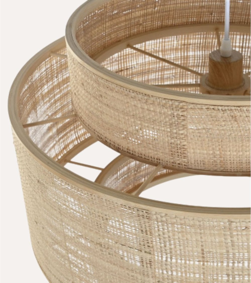 Fabricada con bambú, esta lámpara no solo aporta un ambiente cálido y acogedor, sino que también refleja un compromiso con el medio ambiente. Su color beige claro, típico del bambú sin tratar, realza su encanto rústico y se integra perfectamente en cualquier decoración.