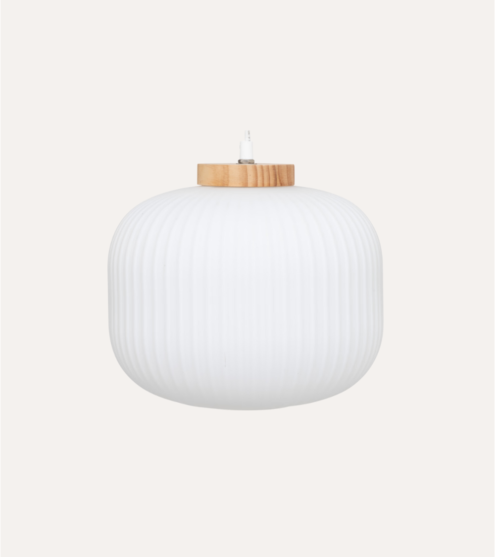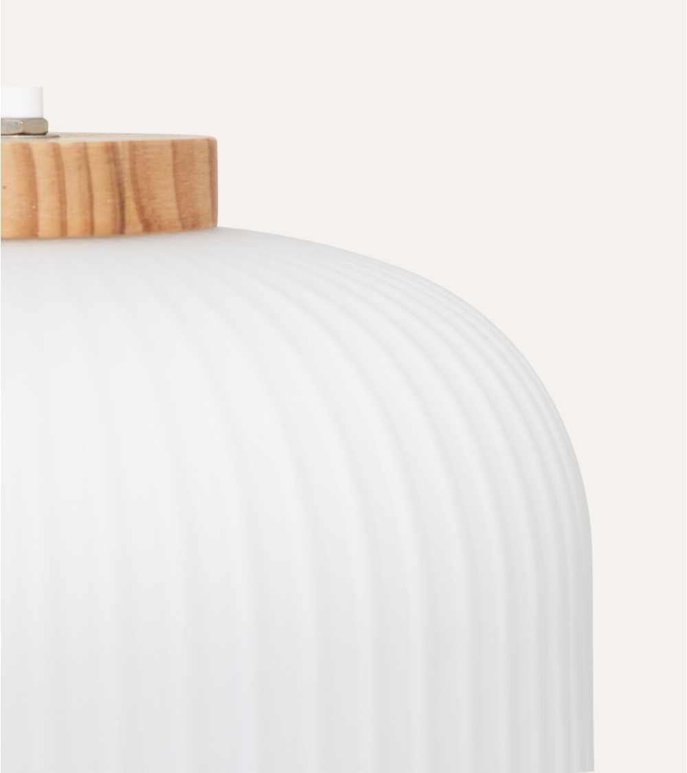 Elemento Superior: En la parte superior de la lámpara se encuentra una tapa circular de madera clara que contrasta maravillosamente con el vidrio. Este detalle natural añade un toque orgánico al diseño contemporáneo.