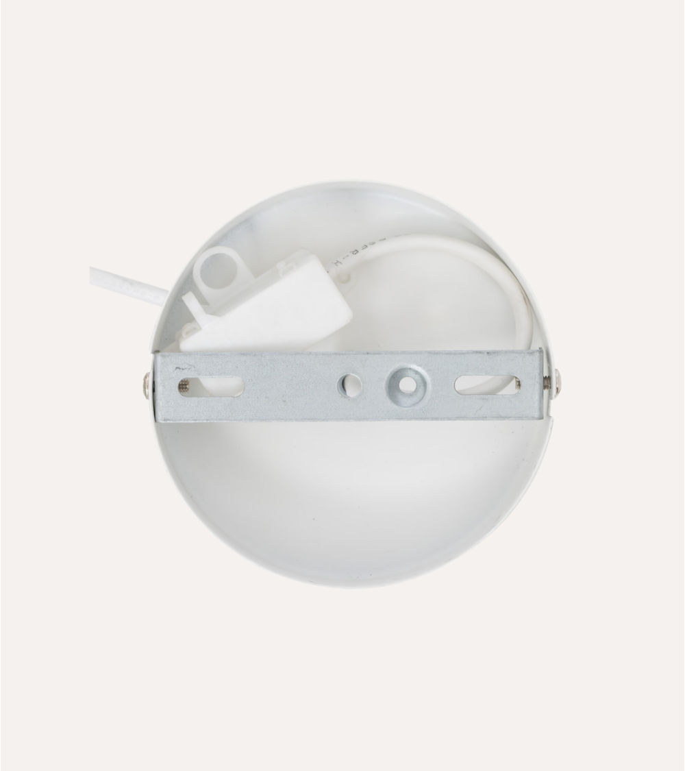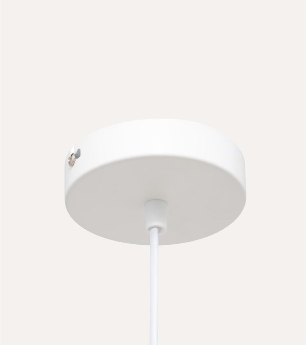 Suspensión: La lámpara cuelga de un cordón delgado y blanco que se conecta a un soporte circular del mismo color. Este enfoque minimalista asegura que toda la atención se centre en el atractivo diseño del producto.