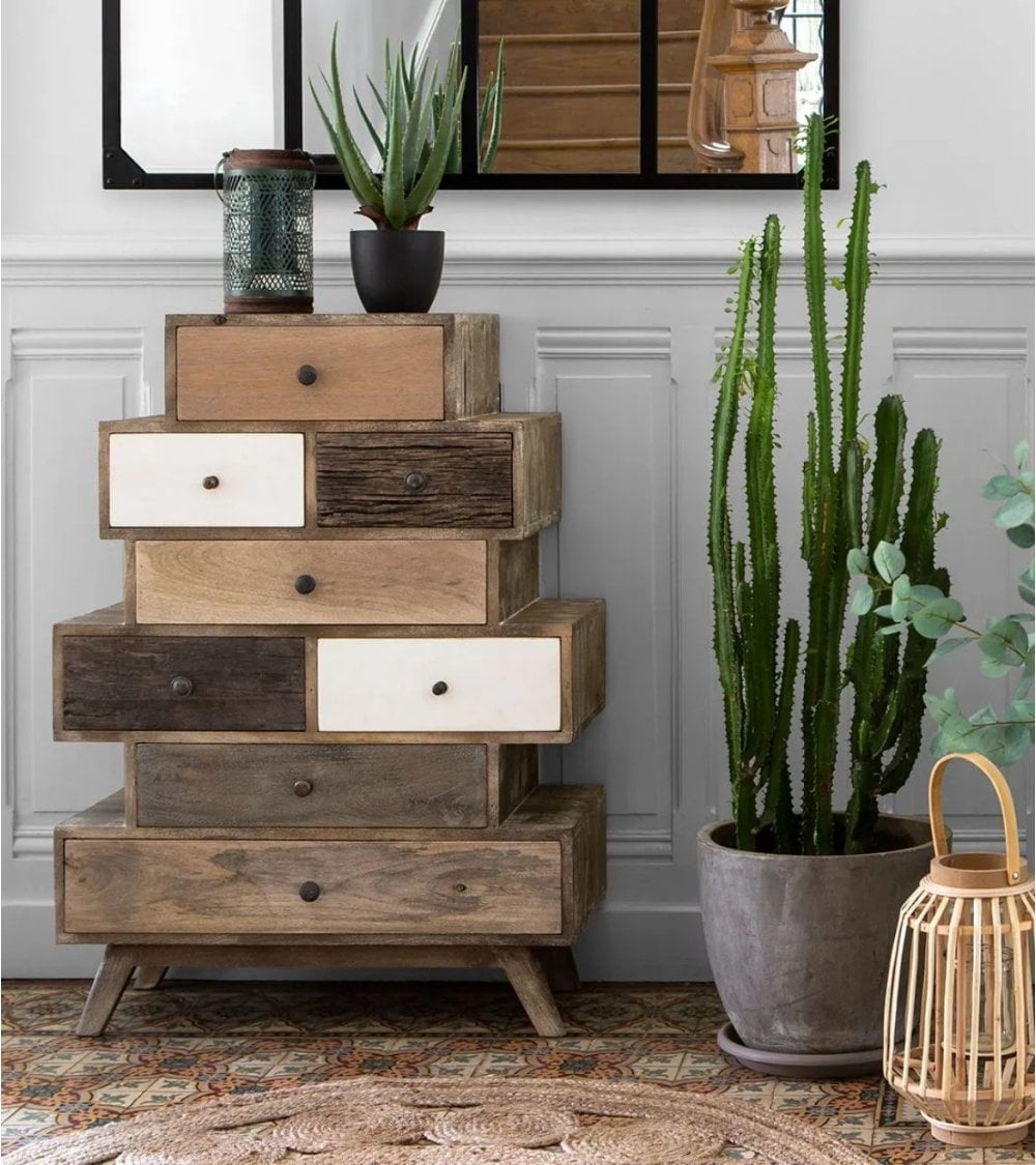 Su diseño moderno se adapta a diferentes estilos decorativos, desde ambientes contemporáneos hasta espacios más rústicos o bohemios. La distribución en 8 cajones permite almacenar una gran variedad de artículos manteniendo el orden y facilitando el acceso rápido a lo que necesitas.