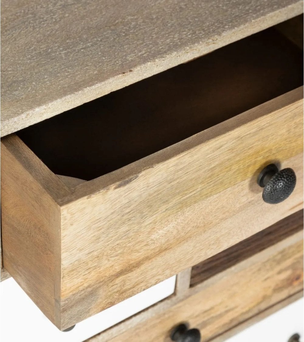 Fabricada en madera de mango, reconocida por su durabilidad y belleza natural, esta cómoda ofrece una estructura sólida que garantiza larga vida útil. La madera presenta vetas únicas que aportan un toque cálido y auténtico a tu decoración, haciendo que cada unidad sea exclusiva.