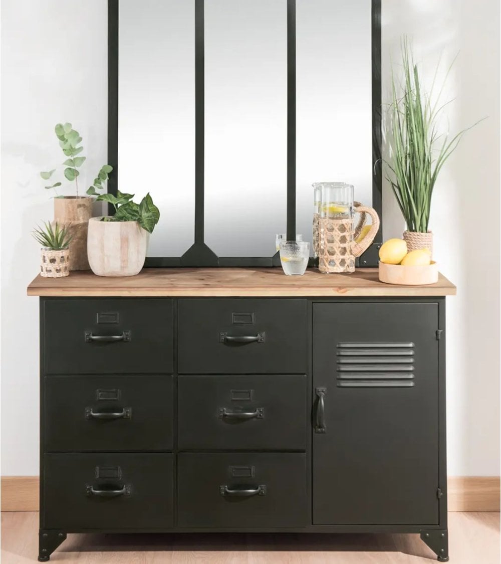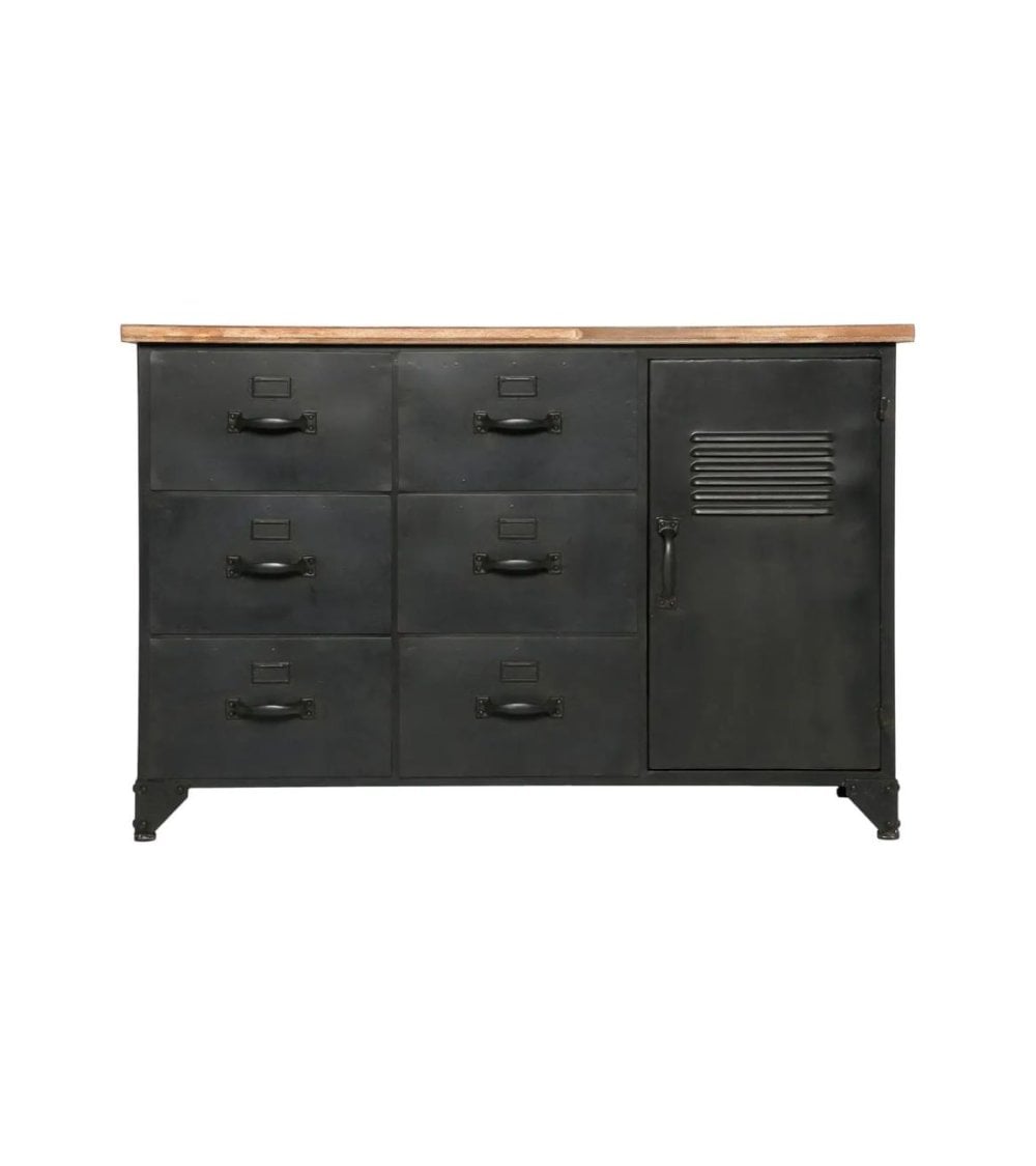 Mueble para dormitorio, hecho en metal color negro y madera, de la colección Cierna. Cuenta con seis cajones y una puerta donde guardar tus diferentes objetos.