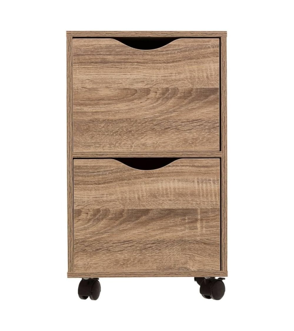 Descubre la cajonera baja con 2 cajones y ruedas, perfecta para organizar tus pertenencias. Con medidas de 33 x 56 x 29.5 cm, esta torre de 2 cajones es compacta pero espaciosa. Sus ruedas permiten un fácil desplazamiento y su efecto de madera semi oscura aporta un toque elegante a cualquier espacio.
