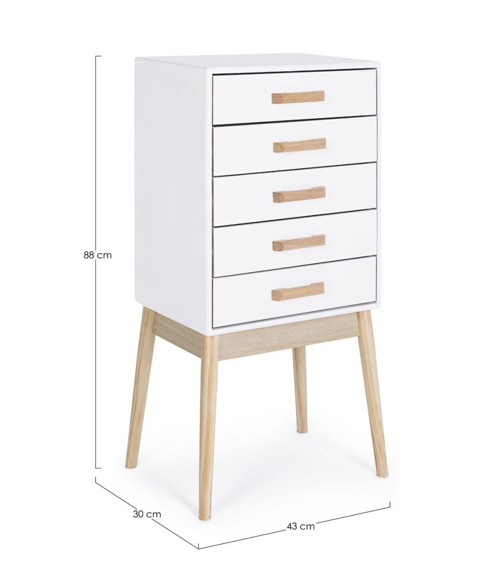 La Cajonera Ordinary con Patas Altas es perfecta para mantener todo organizado. Con 5 cajones delgados, es ideal para guardar desde ropa interior hasta papeles y documentos. Sus medidas son 43 x 30 x 88 cm, un tamaño práctico para cualquier espacio. Está fabricada con patas de madera de pino, paneles de dm y cajones de madera de paulownia, garantizando durabilidad y resistencia. Este producto requiere montaje.