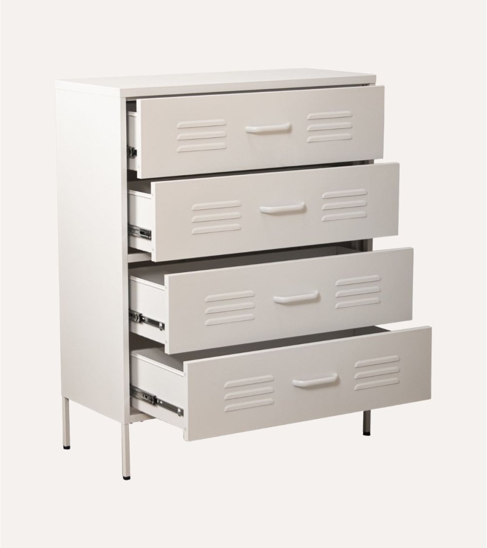La Cómoda Locker con 4 Cajones de Metal es la solución perfecta para aquellos que buscan un almacenamiento práctico y estilizado. Este mueble, con su diseño inspirado en las taquillas de los vestuarios, aporta un toque industrial a cualquier habitación. Su estructura de metal garantiza durabilidad y resistencia, mientras que sus cuatro cajones ofrecen un amplio espacio para guardar ropa, accesorios y otros objetos personales.
