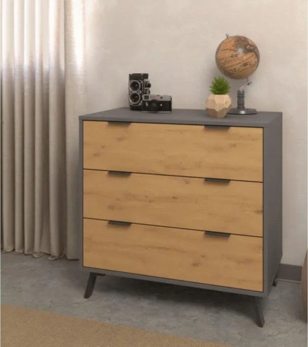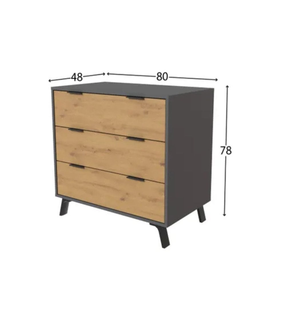 La Cómoda Salor Gris y Roble con 3 Cajones no solo es atractiva a la vista, sino que también ofrece una gran funcionalidad. Sus tres cajones proporcionan un amplio espacio de almacenamiento para ropa, accesorios y otros artículos personales. Además, su superficie superior puede ser utilizada para colocar objetos decorativos, lámparas o incluso un espejo.