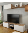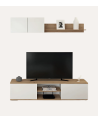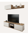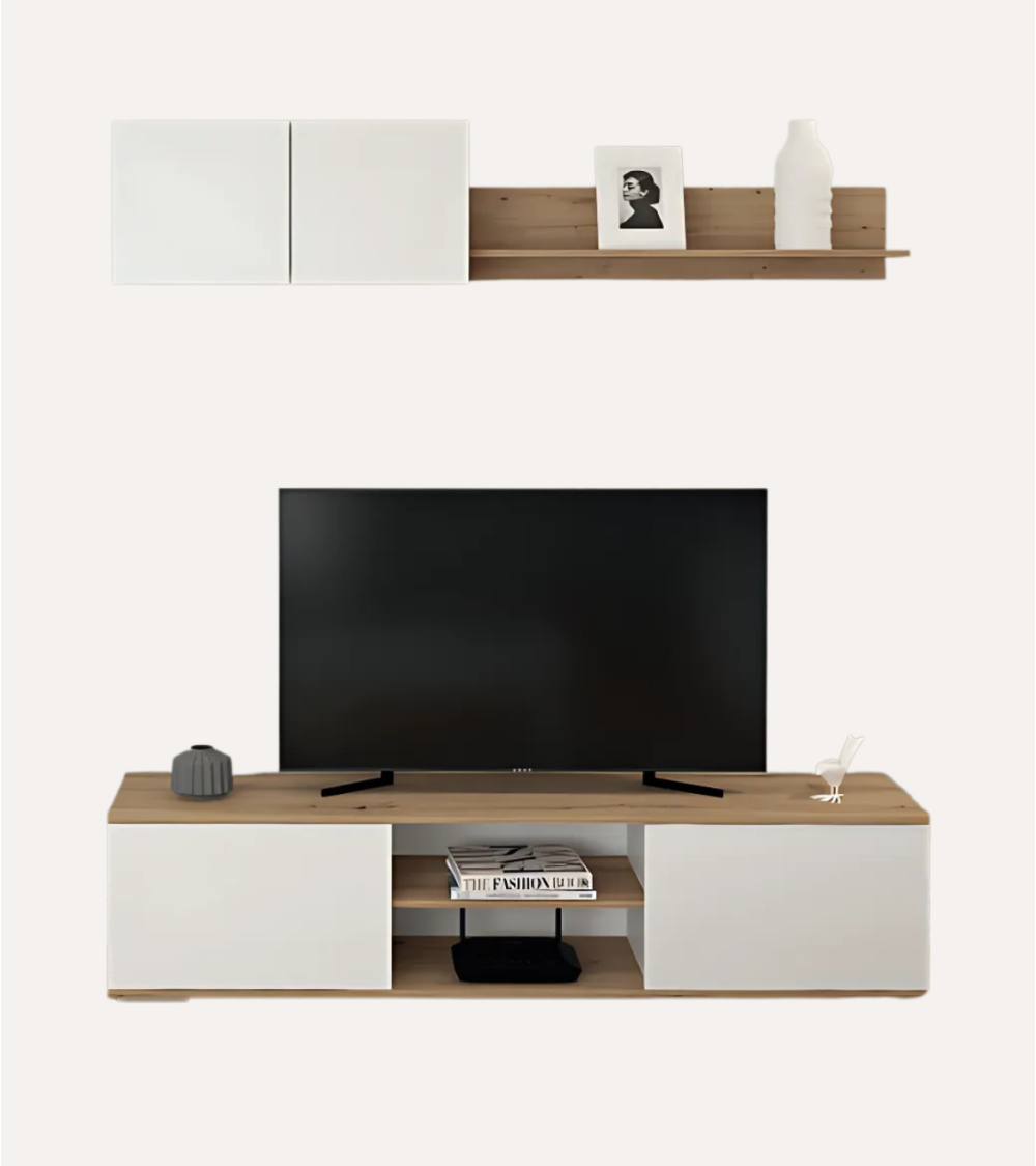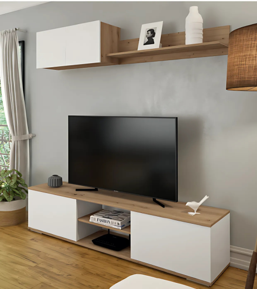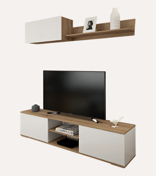 La composición incluye dos elementos principales: un módulo montado en la pared y un soporte para TV. Ambos están diseñados para maximizar el espacio sin sacrificar el estilo.