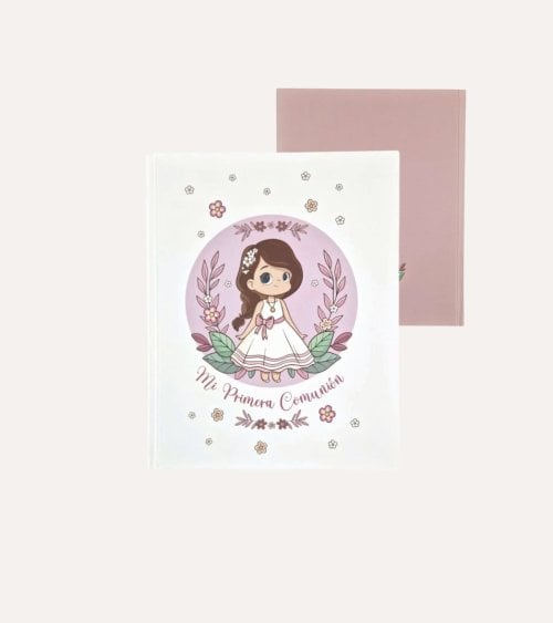 La libreta, decorada con una ilustración dulce de una niña con trenza rodeada por una corona floral, invita a los pequeños a plasmar sus pensamientos y recuerdos. Con el título "Mi Primer Comunión" impreso en una fuente juguetona, esta libreta se convierte en un tesoro personal donde pueden escribir sobre su experiencia.
