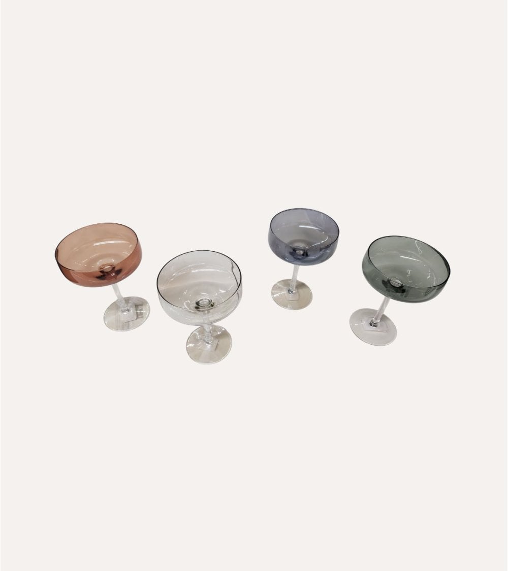 Fabricadas en vidrio de alta calidad, estas copas presentan una forma tradicional tipo coupe, ideal para disfrutar champán, cócteles clásicos como martinis o daiquiris, y otras bebidas que se benefician de una amplia superficie para liberar aromas. Su acabado brillante resalta los colores suaves y variados, creando un conjunto armonioso que embellece cualquier mesa o barra.