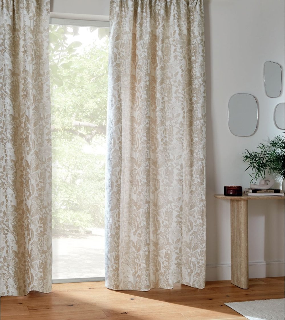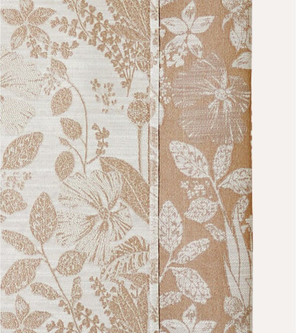 El diseño presenta un patrón floral tonal sutil que añade profundidad visual sin sobrecargar el espacio, manteniendo un equilibrio perfecto entre elegancia y discreción. Además, su tejido ligero proporciona un efecto de caída suave y natural que realza la estética general de la habitación.