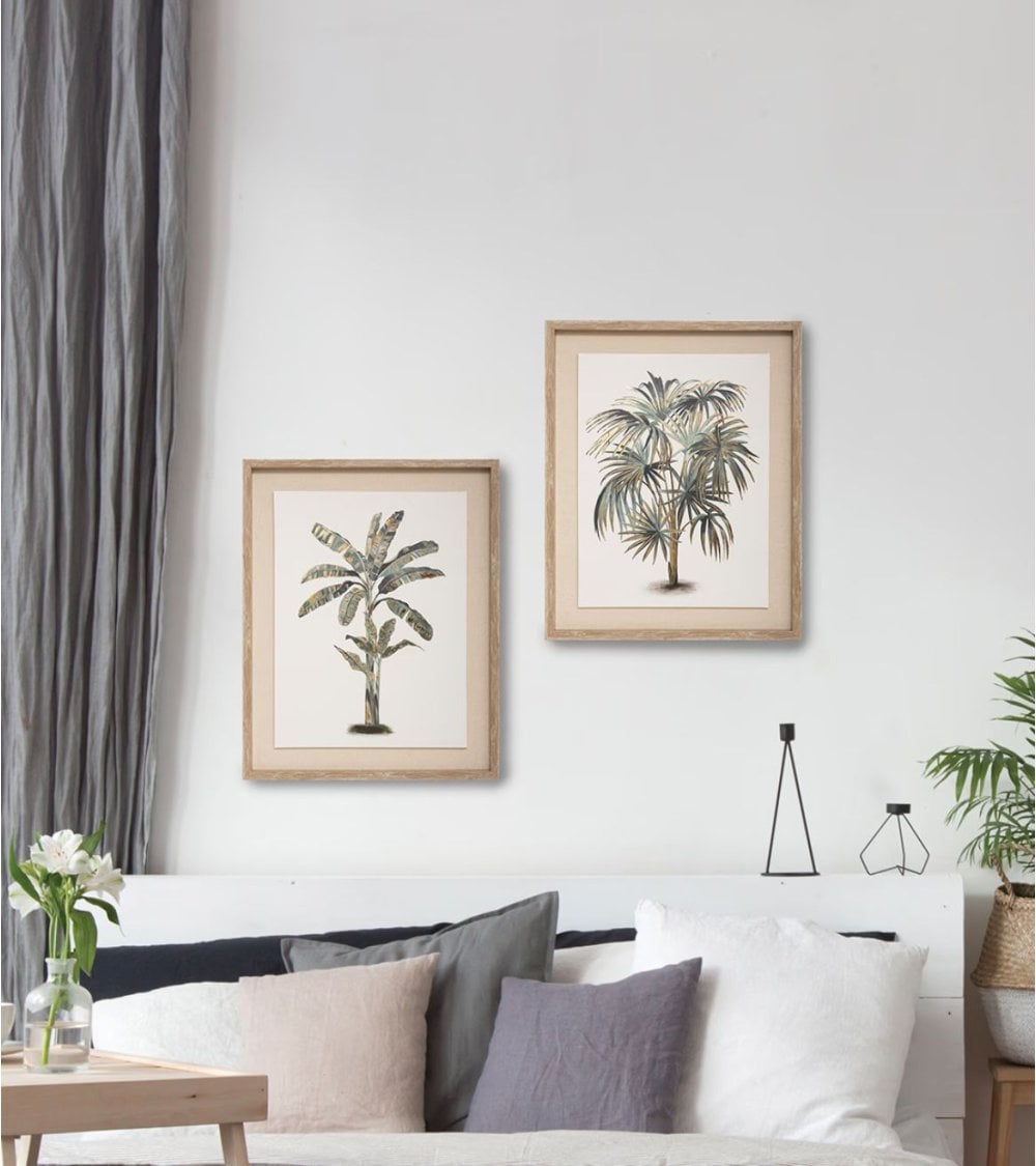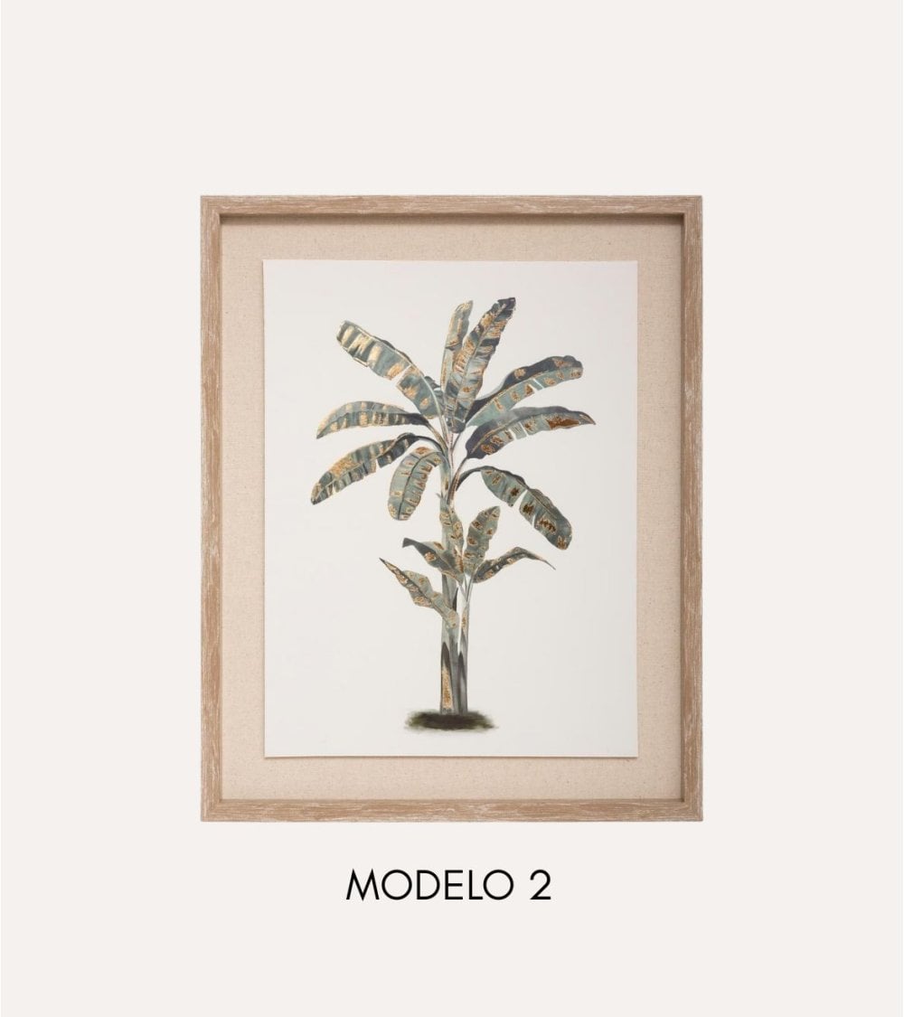 El Cuadro con Lienzo de Árbol Tiana de Lino presenta una ilustración botánica enmarcadas que destacan la belleza de las plantas tropicales. Cada pieza está cuidadosamente enmarcada en un marco de madera clara con un acabado natural, lo que le otorga un aspecto rústico y sofisticado.