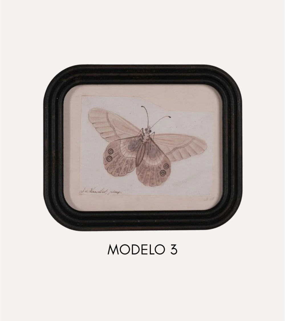 La obra presenta cuatro modelos diferentes de mariposas, cada uno cuidadosamente ilustrado con tonos suaves y apagados como beige, marrón y gris. Estas tonalidades aportan una atmósfera nostálgica que evoca el encanto del pasado, ideal para ambientes vintage o rústicos.