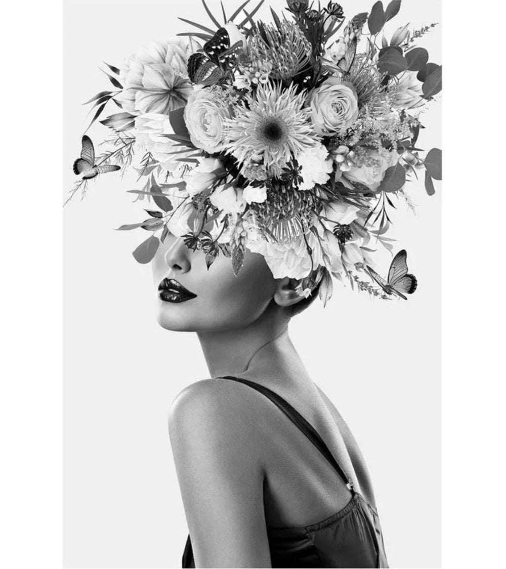 Este cuadro está fabricado en cristal templado. Cuenta con una impresión de una mujer de perfil con un tocado floral en su cabeza, en blanco y negro. Además, gracias a su composición, es super fácil y rápido de limpiar.