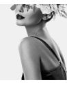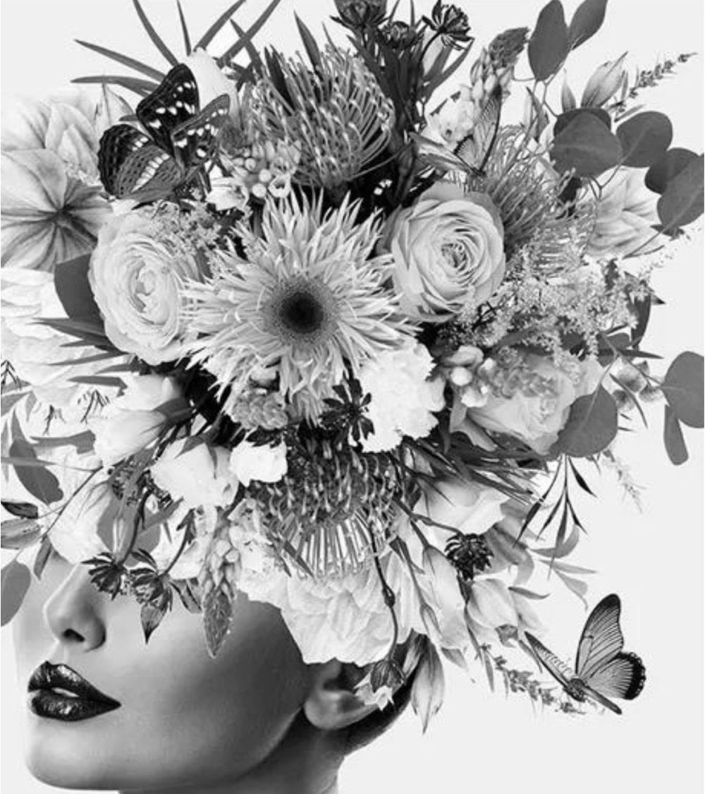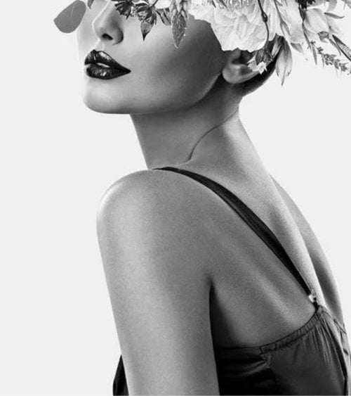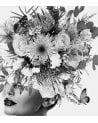Cuadro fabricado en cristal templado con impresión de una mujer de perfil, con un tocado de flores en la cabeza, en blanco y negro.